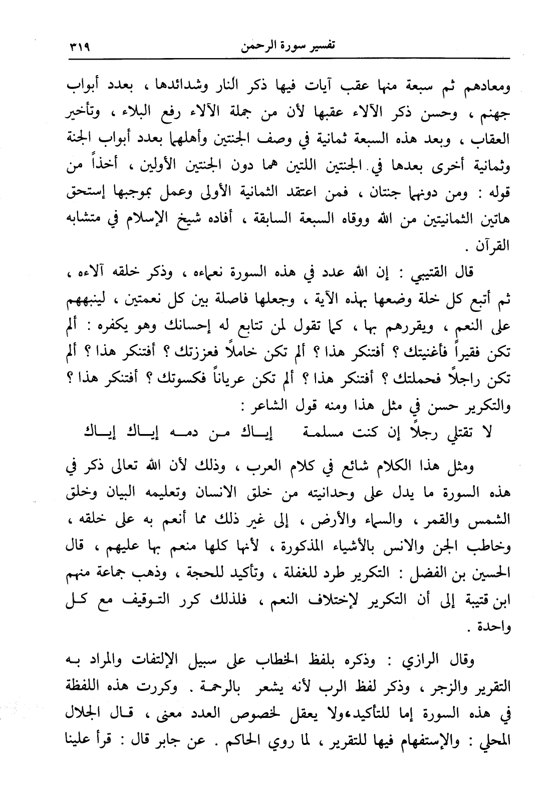 ومثل هذا الكلام شائع في كلام العرب، وذلك لأن الله تعالى ذكر في هذه السورة ما يدل على وحدانيته من خلق الإنسان وتعليمه البيان وخلق الشمس والقمر، والسماء والأرض، إلى غير ذلك مما أنعم به على خلقه، وخاطب الجن والإنس بالأشياء المذكورة، لأنها كلها منعم بها عليهم، قال الحسين بن الفضل: التكرير طرد للغفلة، وتأكيد للحجة، وذهب جماعة منهم ابن قتيبة إلى أن التكرير لإختلاف النعم، فلذلك كرر التوقيف مع كل واحدة.