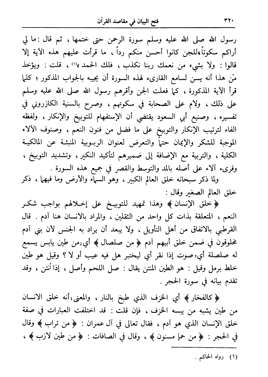 (خلق الإنسان) وهذا تمهيد للتوبيخ على إخلالهم بواجب شكر النعم، المتعلقة بذات كل واحد من الثقلين، والمراد بالإنسان هنا آدم. قال القرطبي بالاتفاق من أهل التأويل، ولا يبعد أن يراد به الجنس لأن بني آدم مخلوقون في ضمن خلق أبيهم آدم (من صلصال) أي: من طين يابس يسمع له صلصلة أي: صوت إذا نقر أي ليختبر هل فيه عيب أو لا؟ وقيل هو طين خلط برمل وقيل: هو الطين المنتن يقال: صل اللحم وأصل، إذا أنتن، وقد تقدم بيانه في سورة الحجر.