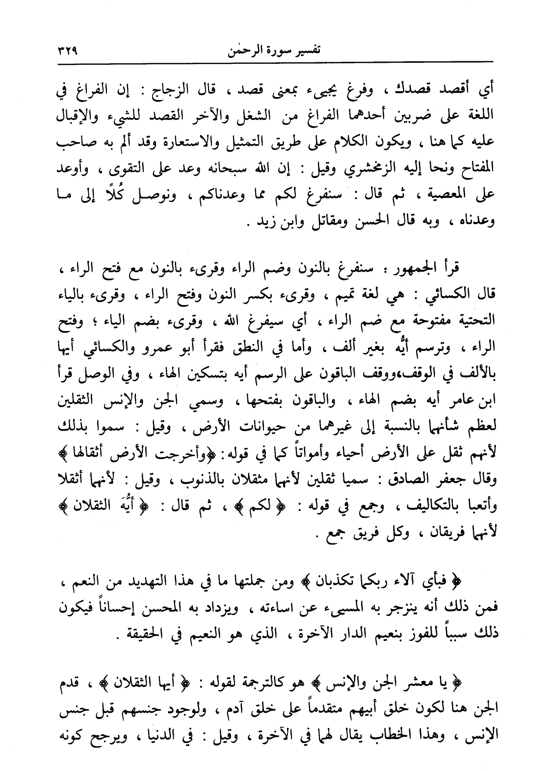 قرأ الجمهور: سنفرغ بالنون وضم الراء وقرىء بالنون مع فتح الراء، قال الكسائي: هي لغة تميم، وقرىء بكسر النون وفتح الراء، وقرىء بالياء التحتية مفتوحة مع ضم الراء، أي سيفرغ الله، وقرىء بضم الياء؛ وفتح الراء، وترسم أيُّه بغير ألف، وأما في النطق فقرأ أبو عمرو والكسائي أيها بالألف في الوقف، ووقف الباقون على الرسم أيه بتسكين الهاء، وفي الوصل قرأ ابن عامر أيه بضم الهاء، والباقون بفتحها، وسمي الجن والإنس الثقلين لعظم شأنهما بالنسبة إلى غيرهما من حيوانات الأرض، وقيل: سموا بذلك لأنهم ثقل على الأرض أحياء وأمواتاً كما في قوله: (وأخرجت الأرض أثقالها) وقال جعفر الصادق: سميا ثقلين لأنهما مثقلان بالذنوب، وقيل: لأنهما أثقلا وأتعبا بالتكاليف، وجمع في قوله: (لَكُمْ)، ثم قال: (أَيُّهَ الثَّقَلَانِ) لأنهما فريقان، وكل فريق جمع.