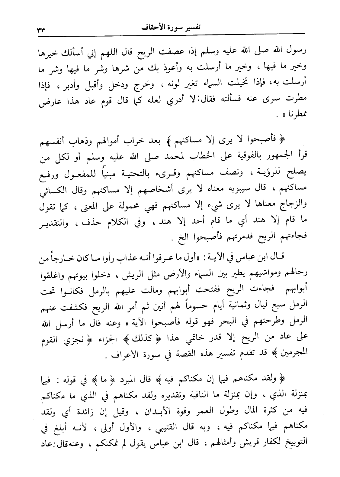 قال ابن عباس في الآية: " أول ما عرفوا أنه عذاب رأوا ما كان خارجاً من رحالهم ومواشيهم يطير بين السماء والأرض مثل الريش، دخلوا بيوتهم وأغلقوا أبوابهم فجاءت الريح ففتحت أبوابهم ومالت عليهم بالرمل فكانوا تحت الرمل سبع ليال وثمانية أيام حسوماً لهم أنين ثم أمر الله الريح فكشفت عنهم الرمل وطرحتهم في البحر فهو قوله فأصبحوا الآية " وعنه قال ما أرسل الله على عاد من الريح إلا قدر خاتمي هذا (كذلك) الجزاء (نجزي القوم المجرمين) قد تقدم تفسير هذه القصة في سورة الأعراف.