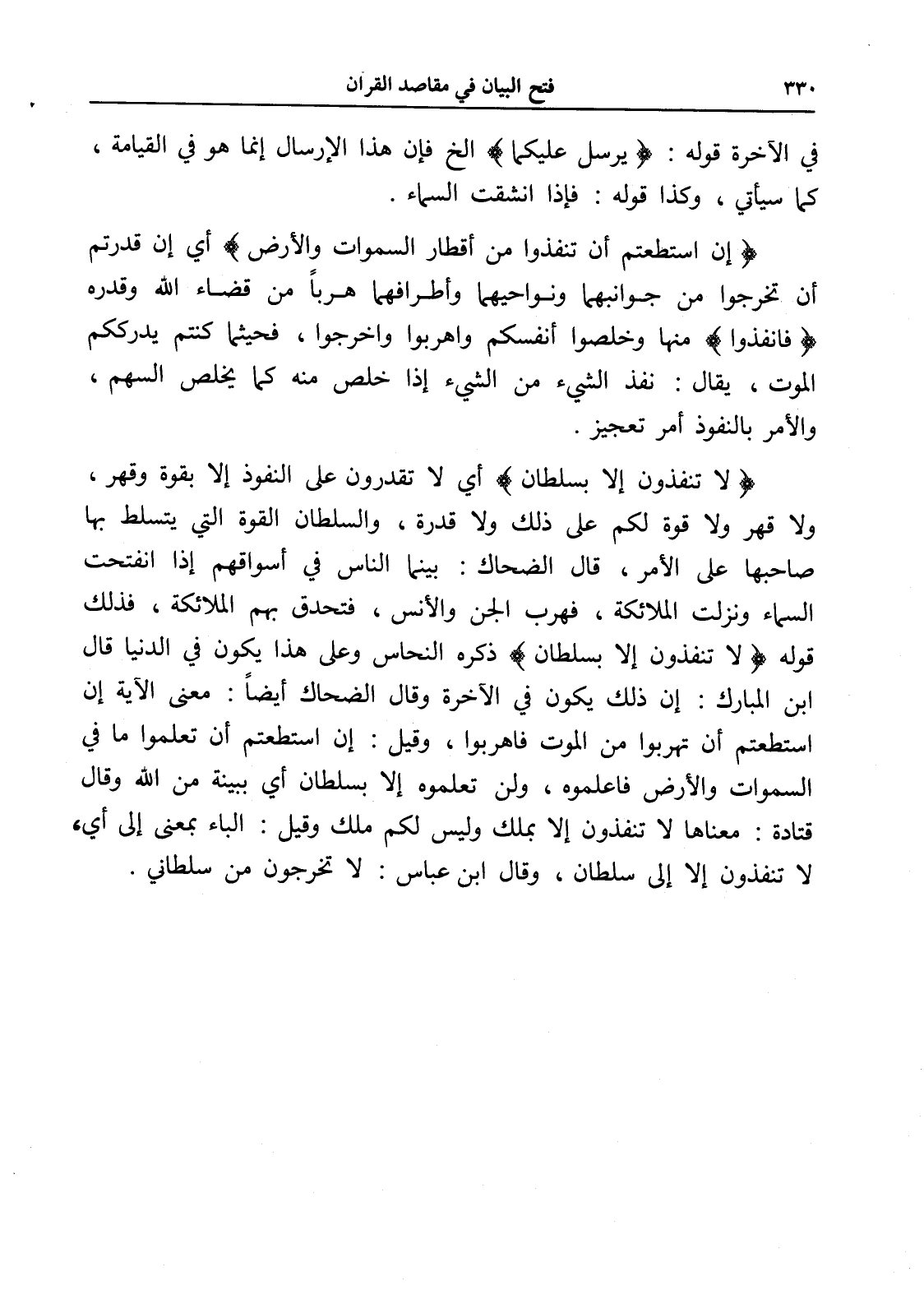 (لا تنفذون إلا بسلطان) أي لا تقدرون على النفوذ إلا بقوة وقهر، ولا قهر ولا قوة لكم على ذلك ولا قدرة، والسلطان القوة التي يتسلط بها صاحبها على الأمر، قال الضحاك: بينما الناس في أسواقهم إذا انفتحت السماء ونزلت الملائكة، فهرب الجن والأنس، فتحدق بهم الملائكة، فذلك قوله (لا تنفذون إلا بسلطان) ذكره النحاس وعلى هذا يكون في الدنيا قال ابن المبارك: إن ذلك يكون في الآخرة وقال الضحاك أيضاًً: معنى الآية إن استطعتم أن تهربوا من الموت فاهربوا، وقيل: إن استطعتم أن تعلموا ما في السموات والأرض فاعلموه، ولن تعلموه إلا بسلطان أي ببينة من الله وقال قتادة: معناها لا تنفذون إلا بملك وليس لكم ملك وقيل: الباء بمعنى إلى أي، لا تنفذون إلا إلى سلطان، وقال ابن عباس: لا تخرجون من سلطاني.