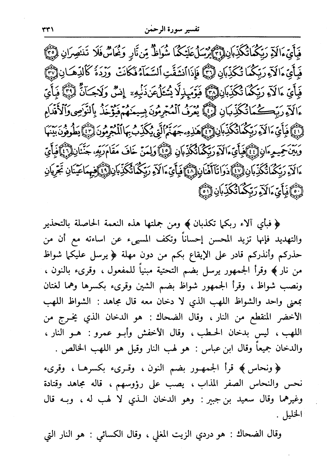 فَبِأَيِّ آلَاءِ رَبِّكُمَا تُكَذِّبَانِ (34) يُرْسَلُ عَلَيْكُمَا شُوَاظٌ مِنْ نَارٍ وَنُحَاسٌ فَلَا تَنْتَصِرَانِ (35) فَبِأَيِّ آلَاءِ رَبِّكُمَا تُكَذِّبَانِ (36) فَإِذَا انْشَقَّتِ السَّمَاءُ فَكَانَتْ وَرْدَةً كَالدِّهَانِ (37) فَبِأَيِّ آلَاءِ رَبِّكُمَا تُكَذِّبَانِ (38) فَيَوْمَئِذٍ لَا يُسْأَلُ عَنْ ذَنْبِهِ إِنْسٌ وَلَا جَانٌّ (39) فَبِأَيِّ آلَاءِ رَبِّكُمَا تُكَذِّبَانِ (40) يُعْرَفُ الْمُجْرِمُونَ بِسِيمَاهُمْ فَيُؤْخَذُ بِالنَّوَاصِي وَالْأَقْدَامِ (41) فَبِأَيِّ آلَاءِ رَبِّكُمَا تُكَذِّبَانِ (42) هَذِهِ جَهَنَّمُ الَّتِي يُكَذِّبُ بِهَا الْمُجْرِمُونَ (43) يَطُوفُونَ بَيْنَهَا وَبَيْنَ حَمِيمٍ آنٍ (44) فَبِأَيِّ آلَاءِ رَبِّكُمَا تُكَذِّبَانِ (45) وَلِمَنْ خَافَ مَقَامَ رَبِّهِ جَنَّتَانِ (46) فَبِأَيِّ آلَاءِ رَبِّكُمَا تُكَذِّبَانِ (47) ذَوَاتَا أَفْنَانٍ (48) فَبِأَيِّ آلَاءِ رَبِّكُمَا تُكَذِّبَانِ (49) فِيهِمَا عَيْنَانِ تَجْرِيَانِ (50) فَبِأَيِّ آلَاءِ رَبِّكُمَا تُكَذِّبَانِ (51)