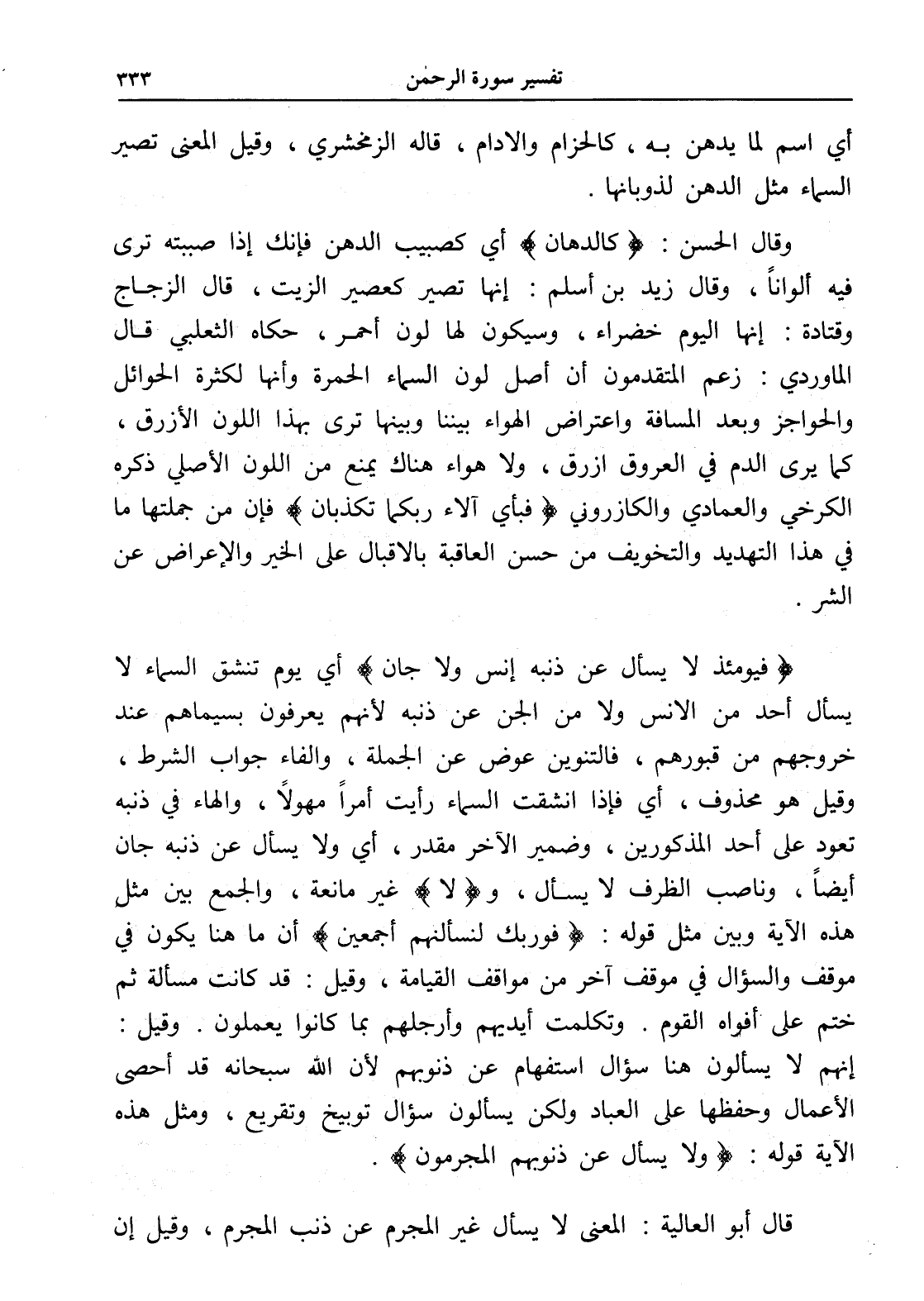 (فيومئذ لا يسأل عن ذنبه إنس ولا جان) أي يوم تنشق السماء لا يسأل أحد من الإنس ولا من الجن عن ذنبه لأنهم يعرفون بسيماهم عند خروجهم من قبورهم، فالتنوين عوض عن الجملة، والفاء جواب الشرط، وقيل هو محذوف، أي فإذا انشقت السماء رأيت أمراً مهولاً، والهاء في ذنبه تعود على أحد المذكورين، وضمير الآخر مقدر، أي ولا يسأل عن ذنبه جان أيضاًً، وناصب الظرف لا يسأل، و (لا) غير مانعة، والجمع بين مثل هذه الآية وبين مثل قوله: (فوربك لنسألنهم أجمعين) أن ما هنا يكون في موقف والسؤال في موقف آخر من مواقف القيامة، وقيل: قد كانت مسألة ثم ختم على أفواه القوم. وتكلمت أيديهم وأرجلهم بما كانوا يعملون. وقيل: إنهم لا يسألون هنا سؤال استفهام عن ذنوبهم لأن الله سبحانه قد أحصى الأعمال وحفظها على العباد ولكن يسألون سؤال توبيخ وتقريع، ومثل هذه الآية قوله: (ولا يسأل عن ذنوبهم المجرمون).