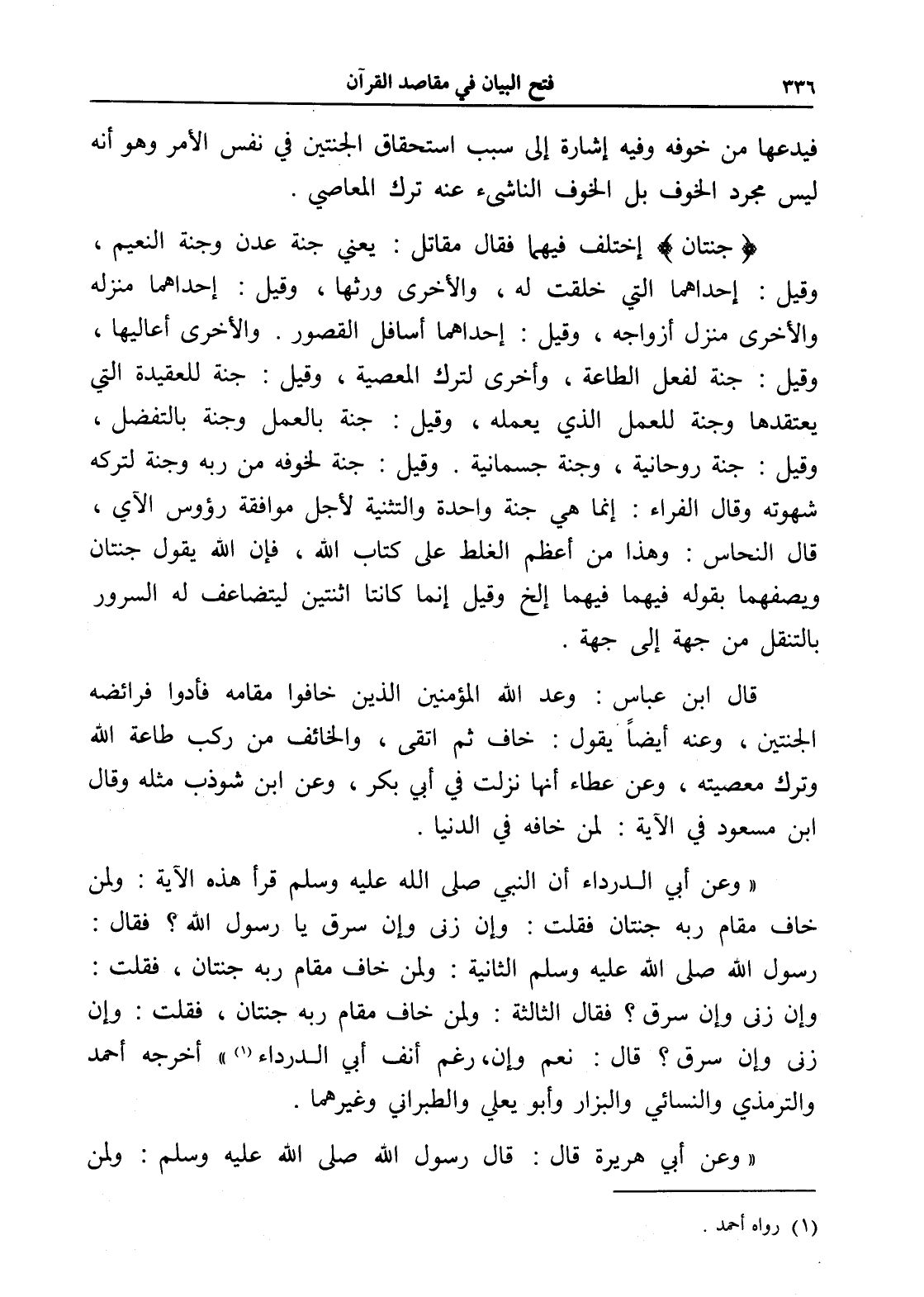 قال ابن عباس: وعد الله المؤمنين الذين خافوا مقامه فأدوا فرائضه الجنتين، وعنه أيضاًً يقول: خاف ثم اتقى، والخائف من ركب طاعة الله وترك معصيته، وعن عطاء أنها نزلت في أبي بكر، وعن ابن شوذب مثله وقال ابن مسعود في الآية: لمن خافه في الدنيا.