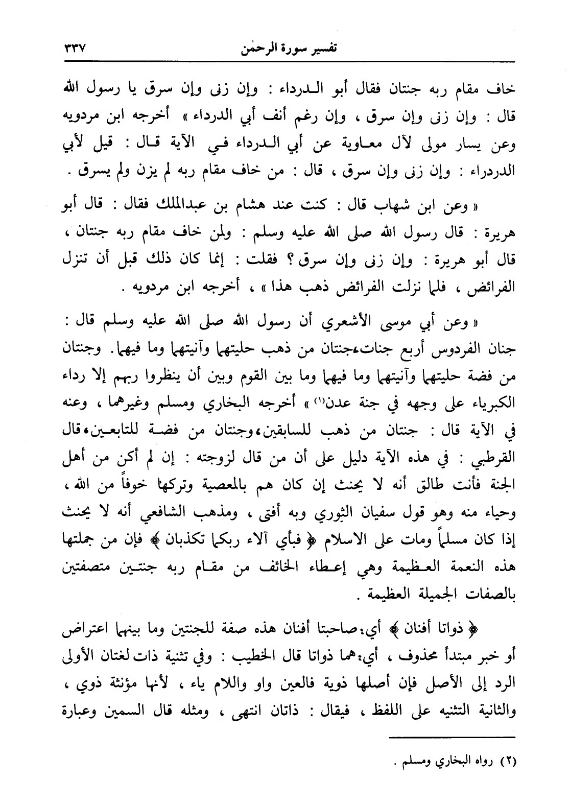 " وعن أبي موسى الأشعري أن رسول الله صلى الله عليه وسلم قال: جنان الفردوس أربع جنات، جنتان من ذهب حليتهما وآنيتهما وما فيهما. وجنتان من فضة حليتهما وآنيتهما وما فيهما وما بين القوم وبين أن ينظروا ربهم إلا رداء الكبرياء على وجهه في جنة عدن (¬1) " أخرجه البخاري ومسلم وغيرهما، وعنه في الآية قال: جنتان من ذهب للسابقين، وجنتان من فضة للتابعين، قال القرطبي: في هذه الآية دليل على أن من قال لزوجته: إن لم أكن من أهل الجنة فأنت طالق أنه لا يحنث إن كان هم بالمعصية وتركها خوفاً من الله، وحياء منه وهو قول سفيان الثوري وبه أفتى، ومذهب الشافعي أنه لا يحنث إذا كان مسلماً ومات على الإسلام