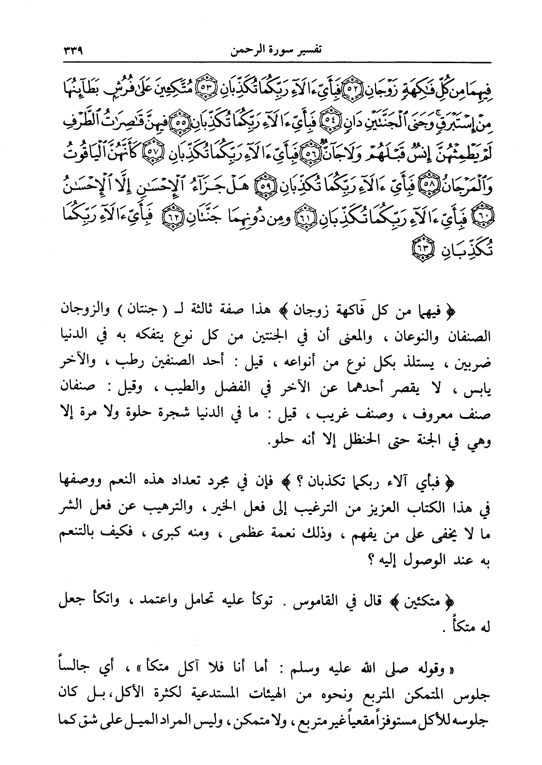 فِيهِمَا مِنْ كُلِّ فَاكِهَةٍ زَوْجَانِ (52) فَبِأَيِّ آلَاءِ رَبِّكُمَا تُكَذِّبَانِ (53) مُتَّكِئِينَ عَلَى فُرُشٍ بَطَائِنُهَا مِنْ إِسْتَبْرَقٍ وَجَنَى الْجَنَّتَيْنِ دَانٍ (54) فَبِأَيِّ آلَاءِ رَبِّكُمَا تُكَذِّبَانِ (55) فِيهِنَّ قَاصِرَاتُ الطَّرْفِ لَمْ يَطْمِثْهُنَّ إِنْسٌ قَبْلَهُمْ وَلَا جَانٌّ (56) فَبِأَيِّ آلَاءِ رَبِّكُمَا تُكَذِّبَانِ (57) كَأَنَّهُنَّ الْيَاقُوتُ وَالْمَرْجَانُ (58) فَبِأَيِّ آلَاءِ رَبِّكُمَا تُكَذِّبَانِ (59) هَلْ جَزَاءُ الْإِحْسَانِ إِلَّا الْإِحْسَانُ (60) فَبِأَيِّ آلَاءِ رَبِّكُمَا تُكَذِّبَانِ (61) وَمِنْ دُونِهِمَا جَنَّتَانِ (62) فَبِأَيِّ آلَاءِ رَبِّكُمَا تُكَذِّبَانِ (63)