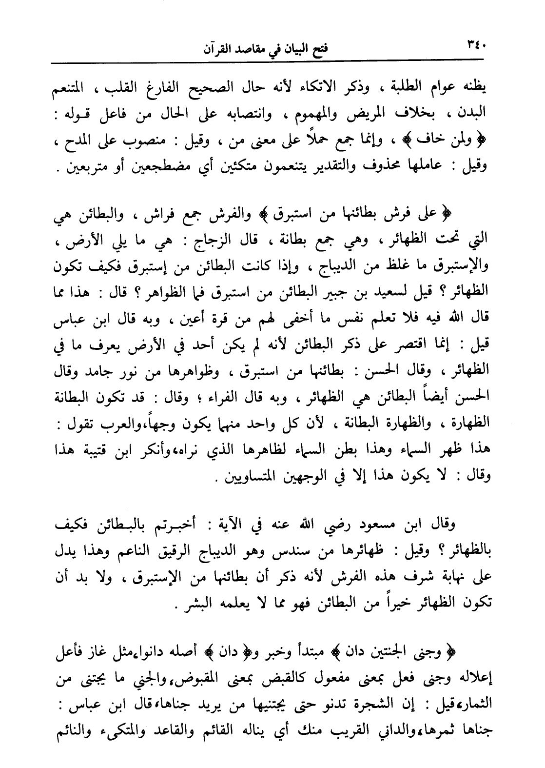 (عَلَى فُرُشٍ بَطَائِنُهَا مِنْ إِسْتَبْرَقٍ) والفرش جمع فراش، والبطائن هي التي تحت الظهائر، وهي جمع بطانة، قال الزجاج: هي ما يلي الأرض، والإستبرق ما غلظ من الديباج، وإذا كانت البطائن من إستبرق فكيف تكون الظهائر؟ قيل لسعيد بن جبير البطائن من استبرق فما الظواهر؟ قال: هذا مما قال الله فيه فلا تعلم نفس ما أخفى لهم من قرة أعين، وبه قال ابن عباس قيل: إنما اقتصر على ذكر البطائن لأنه لم يكن أحد في الأرض يعرف ما في الظهائر، وقال الحسن: بطائنها من إستبرق، وظواهرها من نور جامد وقال الحسن أيضاًً البطائن هي الظهائر، وبه قال الفراء؛ وقال: قد تكون البطانة الظهارة، والظهارة البطانة، لأن كل واحد منهما يكون وجهاً، والعرب تقول: هذا ظهر السماء وهذا بطن السماء لظاهرها الذي نراه، وأنكر ابن قتيبة هذا وقال: لا يكون هذا إلا في الوجهين المتساويين.