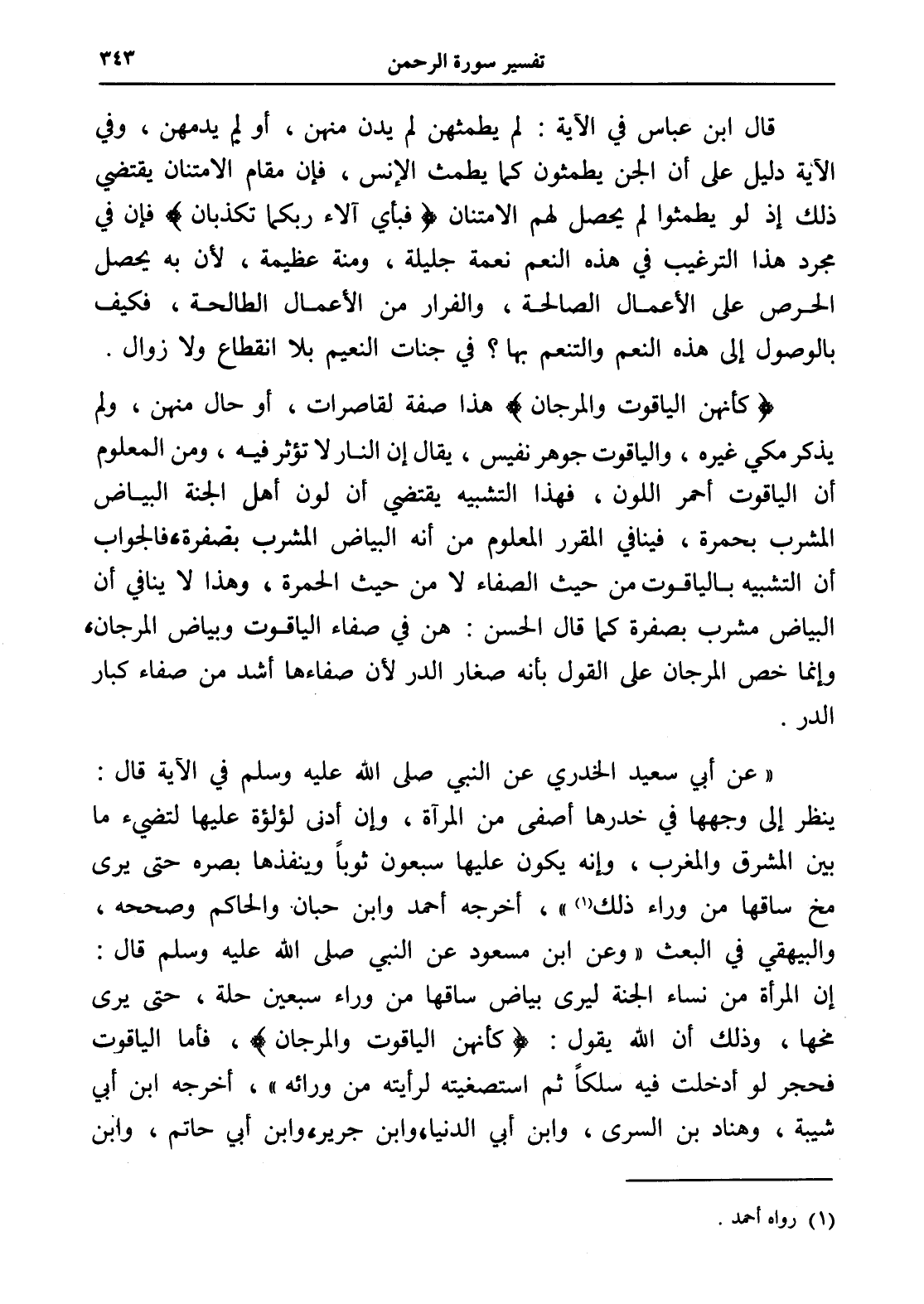 " عن أبي سعيد الخدري عن النبي صلى الله عليه وسلم في الآية قال: ينظر إلى وجهها في خدرها أصفى من المرآة، وإن أدنى لؤلؤة عليها لتضيء ما بين المشرق والمغرب، وإنه يكون عليها سبعون ثوباً وينفذها بصره حتى يرى مخ ساقها من وراء ذلك (¬1) "، أخرجه أحمد وابن حبان. والحاكم وصححه، والبيهقي في البعث " وعن ابن مسعود عن النبي صلى الله عليه وسلم قال: إن المرأة من نساء الجنة ليرى بياض ساقها من وراء سبعين حلة، حتى يرى مخها، وذلك أن الله يقول: (كأنهن الياقوت والمرجان)، فأما الياقوت فحجر لو أدخلت فيه سلكاً ثم استصغيته لرأيته من ورائه "، أخرجه ابن أبي شيبة، وهناد بن السرى، وابن أبي الدنيا، وابن جرير، وابن أبي حاتم، وابن