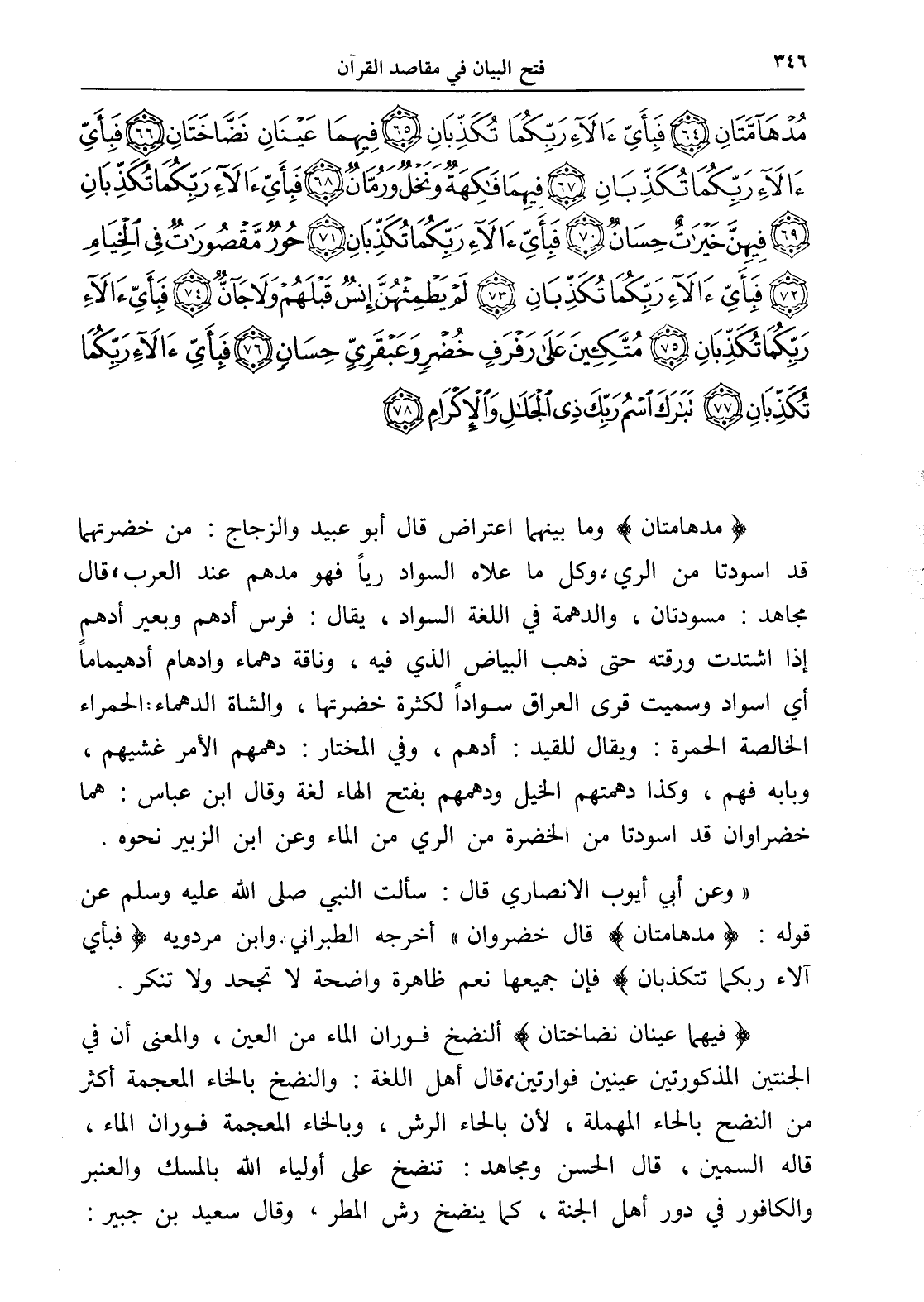 مُدْهَامَّتَانِ (64) فَبِأَيِّ آلَاءِ رَبِّكُمَا تُكَذِّبَانِ (65) فِيهِمَا عَيْنَانِ نَضَّاخَتَانِ (66) فَبِأَيِّ آلَاءِ رَبِّكُمَا تُكَذِّبَانِ (67) فِيهِمَا فَاكِهَةٌ وَنَخْلٌ وَرُمَّانٌ (68) فَبِأَيِّ آلَاءِ رَبِّكُمَا تُكَذِّبَانِ (69) فِيهِنَّ خَيْرَاتٌ حِسَانٌ (70) فَبِأَيِّ آلَاءِ رَبِّكُمَا تُكَذِّبَانِ (71) حُورٌ مَقْصُورَاتٌ فِي الْخِيَامِ (72) فَبِأَيِّ آلَاءِ رَبِّكُمَا تُكَذِّبَانِ (73) لَمْ يَطْمِثْهُنَّ إِنْسٌ قَبْلَهُمْ وَلَا جَانٌّ (74) فَبِأَيِّ آلَاءِ رَبِّكُمَا تُكَذِّبَانِ (75) مُتَّكِئِينَ عَلَى رَفْرَفٍ خُضْرٍ وَعَبْقَرِيٍّ حِسَانٍ (76) فَبِأَيِّ آلَاءِ رَبِّكُمَا تُكَذِّبَانِ (77) تَبَارَكَ اسْمُ رَبِّكَ ذِي الْجَلَالِ وَالْإِكْرَامِ (78)