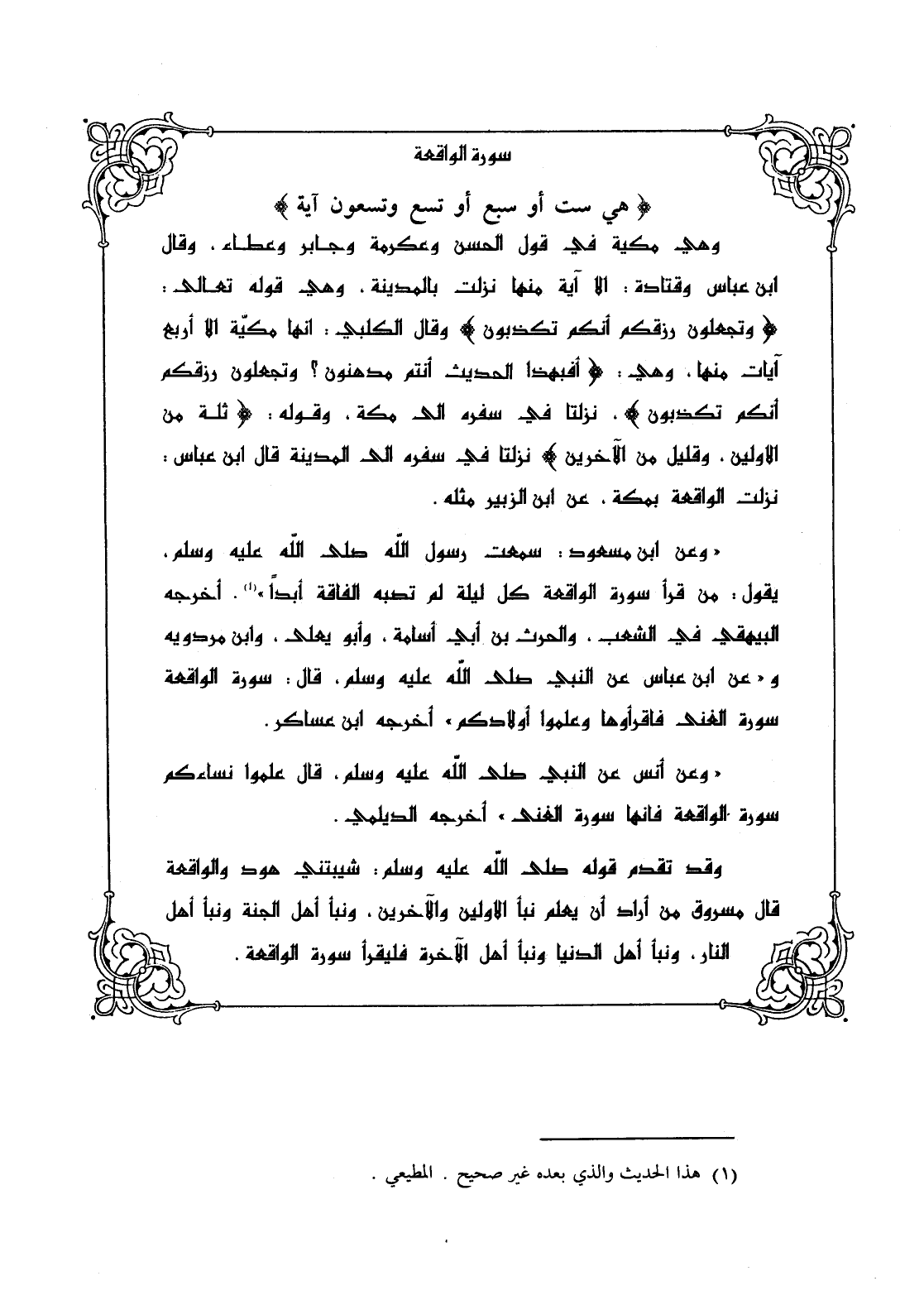 وعن ابن مسعود: سمعت رسول الله - صلى الله عليه وسلم -، يقول: " من قرأ سورة الواقعة كل ليلة لم تصبه الفاقة أبداً " (¬1)، أخرجه البيهقي في الشعب، والحرث بن أبي أسلمة، وأبو يعلى، وابن مردويه وعن ابن عباس عن النبي - صلى الله عليه وسلم - قال: " سورة الواقعة سورة الغنى فاقرأوها وعلموا أولادكم " أخرجه ابن عساكر.