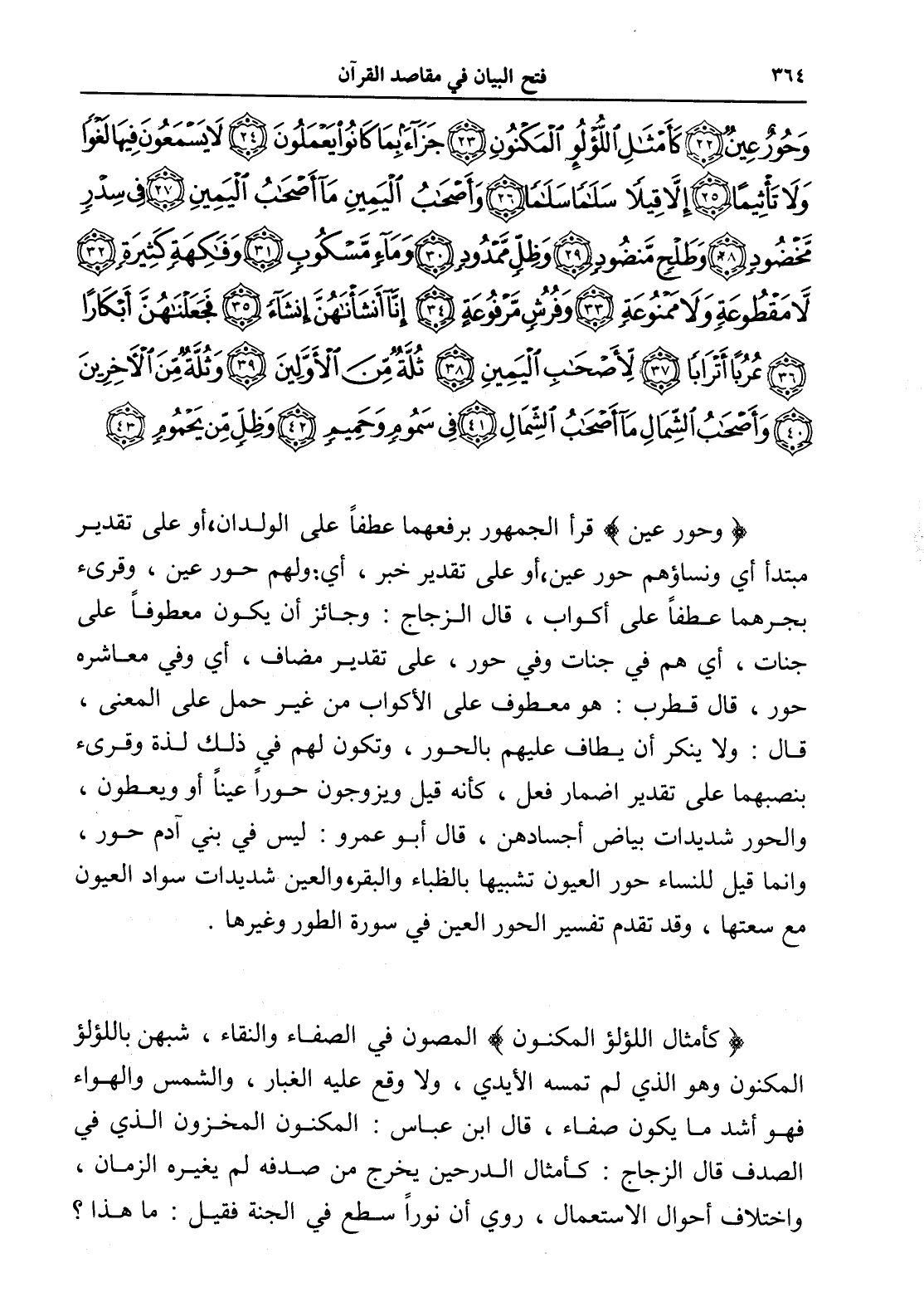 وَحُورٌ عِينٌ (22) كَأَمْثَالِ اللُّؤْلُؤِ الْمَكْنُونِ (23) جَزَاءً بِمَا كَانُوا يَعْمَلُونَ (24) لَا يَسْمَعُونَ فِيهَا لَغْوًا وَلَا تَأْثِيمًا (25) إِلَّا قِيلًا سَلَامًا سَلَامًا (26) وَأَصْحَابُ الْيَمِينِ مَا أَصْحَابُ الْيَمِينِ (27) فِي سِدْرٍ مَخْضُودٍ (28) وَطَلْحٍ مَنْضُودٍ (29) وَظِلٍّ مَمْدُودٍ (30) وَمَاءٍ مَسْكُوبٍ (31) وَفَاكِهَةٍ كَثِيرَةٍ (32) لَا مَقْطُوعَةٍ وَلَا مَمْنُوعَةٍ (33) وَفُرُشٍ مَرْفُوعَةٍ (34) إِنَّا أَنْشَأْنَاهُنَّ إِنْشَاءً (35) فَجَعَلْنَاهُنَّ أَبْكَارًا (36) عُرُبًا أَتْرَابًا (37) لِأَصْحَابِ الْيَمِينِ (38) ثُلَّةٌ مِنَ الْأَوَّلِينَ (39) وَثُلَّةٌ مِنَ الْآخِرِينَ (40) وَأَصْحَابُ الشِّمَالِ مَا أَصْحَابُ الشِّمَالِ (41) فِي سَمُومٍ وَحَمِيمٍ (42) وَظِلٍّ مِنْ يَحْمُومٍ (43)