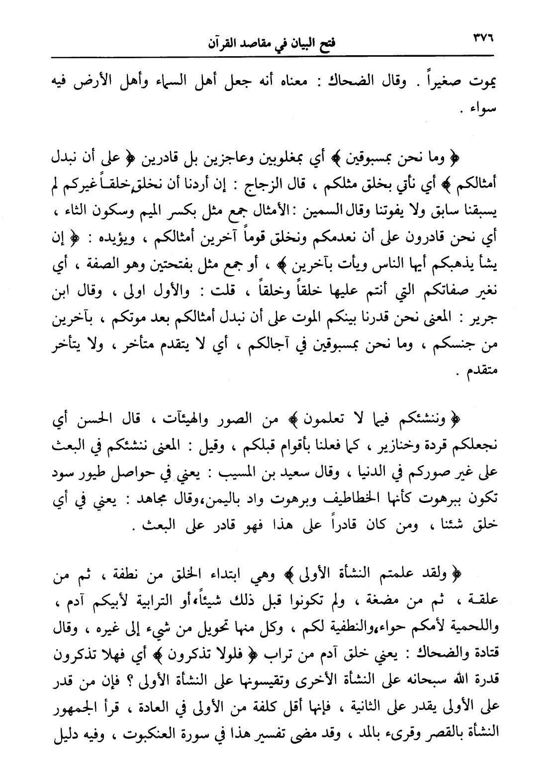(على أن نبدل أمثالكم) أي نأتي بخلق مثلكم، قال الزجاج: إن أردنا أن نخلق خلقاً غيركم لم يسبقنا سابق ولا يفوتنا وقال السمين: الأمثال جمع مثل بكسر الميم وسكون الثاء، أي نحن قادرون على أن نعدمكم ونخلق قوماً آخرين أمثالكم، ويؤيده: (إِنْ يَشَأْ يُذْهِبْكُمْ أَيُّهَا النَّاسُ وَيَأْتِ بِآخَرِينَ)، أو جمع مثل بفتحتين وهو الصفة، أي نغير صفاتكم التي أنتم عليها خلقاً وخلقاً، قلت: والأول أولى، وقال ابن جرير: المعنى نحن قدرنا بينكم الموت على أن نبدل أمثالكم بعد موتكم، بآخرين من جنسكم، وما نحن بمسبوقين في آجالكم، أي لا يتقدم متأخر، ولا يتأخر متقدم.