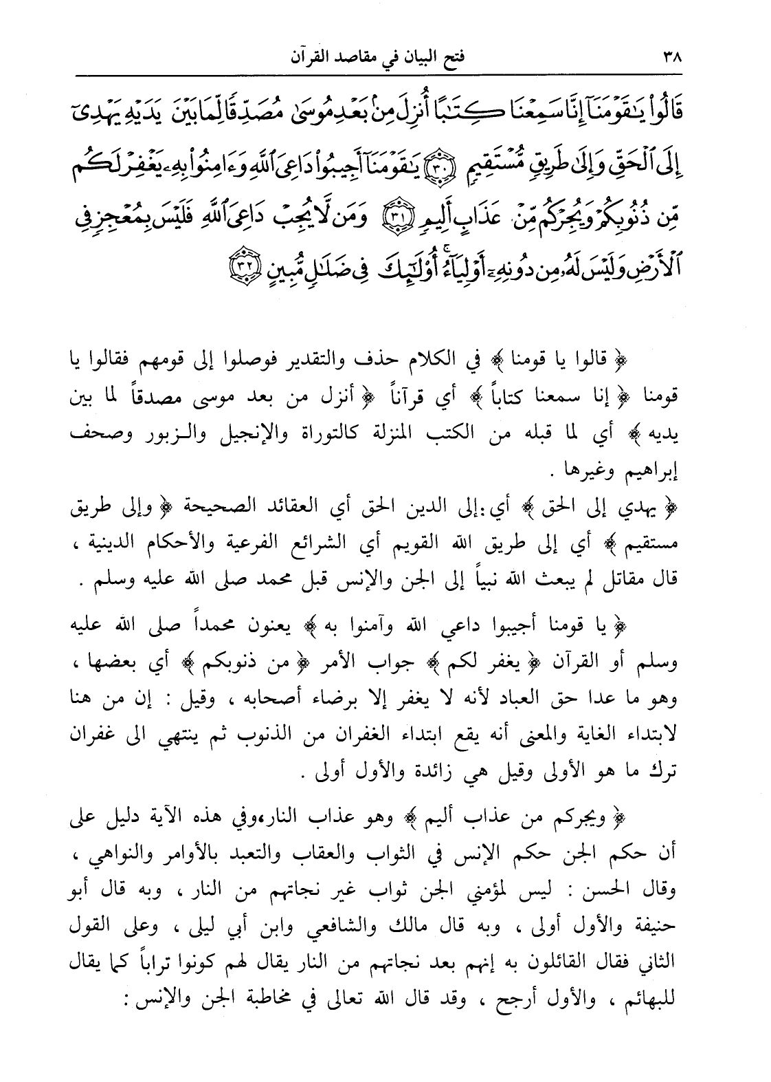 قَالُوا يَا قَوْمَنَا إِنَّا سَمِعْنَا كِتَابًا أُنْزِلَ مِنْ بَعْدِ مُوسَى مُصَدِّقًا لِمَا بَيْنَ يَدَيْهِ يَهْدِي إِلَى الْحَقِّ وَإِلَى طَرِيقٍ مُسْتَقِيمٍ (30) يَا قَوْمَنَا أَجِيبُوا دَاعِيَ اللَّهِ وَآمِنُوا بِهِ يَغْفِرْ لَكُمْ مِنْ ذُنُوبِكُمْ وَيُجِرْكُمْ مِنْ عَذَابٍ أَلِيمٍ (31) وَمَنْ لَا يُجِبْ دَاعِيَ اللَّهِ فَلَيْسَ بِمُعْجِزٍ فِي الْأَرْضِ وَلَيْسَ لَهُ مِنْ دُونِهِ أَوْلِيَاءُ أُولَئِكَ فِي ضَلَالٍ مُبِينٍ (32)