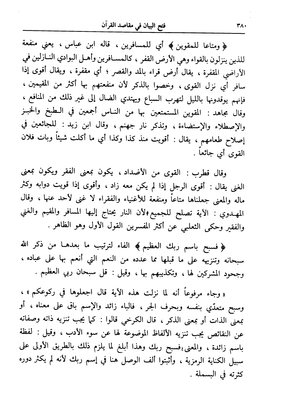 (وَمَتَاعًا لِلْمُقْوِينَ) أي للمسافرين، قاله ابن عباس، يعني منفعة للذين ينزلون بالقواء وهي الأرض القفر، كالمسافرين وأهل البوادي النازلين في الأراضي المقفرة، يقال أرض قراء بالمد والقصر؛ أي مقفرة، ويقال أقوى إذا سافر أي نزل القوى، وخصوا بالذكر لأن منفعتهم بها أكثر من المقيمين، فإنهم يوقدونها بالليل لتهرب السباع ويهتدي الضال إلى غير ذلك من المنافع، وقال مجاهد: المقوين المستمتعين بها من الناس أجمعين في الطبخ والخبز والإصطلاء والإستضاءة، وتذكر نار جهنم، وقال ابن زيد: للجائعين في إصلاح طعامهم، يقال: أقويت منذ كذا وكذا أي ما أكلت شيئاًً وبات فلان القوى أي جائعاً.