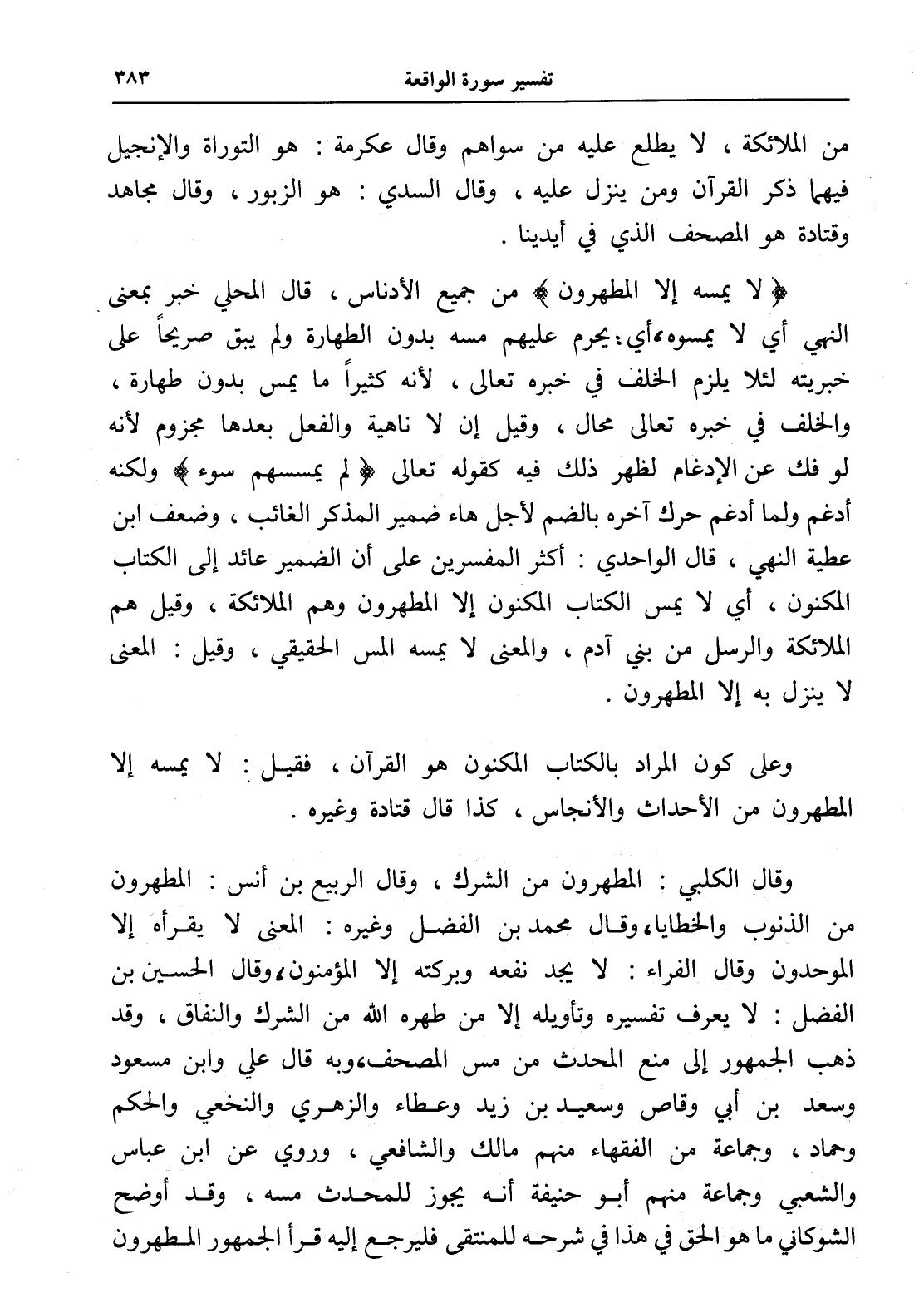وقال الكلبي: المطهرون من الشرك، وقال الربيع بن أنس: المطهرون من الذنوب والخطايا، وقال محمد بن الفضل وغيره: المعنى لا يقرأه إلا الموحدون وقال الفراء: لا يجد نفعه وبركته إلا المؤمنون، وقال الحسين بن الفضل: لا يعرف تفسيره وتأويله إلا من طهره الله من الشرك والنفاق، وقد ذهب الجمهور إلى منع المحدث من مس المصحف، وبه قال علي وابن مسعود وسعد بن أبي وقاص وسعيد بن زيد وعطاء والزهري والنخعي والحكم وحماد، وجماعة من الفقهاء منهم مالك والشافعي، وروي عن ابن عباس والشعبي وجماعة منهم أبو حنيفة أنه يجوز للمحدث مسه، وقد أوضح الشوكاني ما هو الحق في هذا في شرحه للمنتقى فليرجع إليه قرأ الجمهور المطهرون