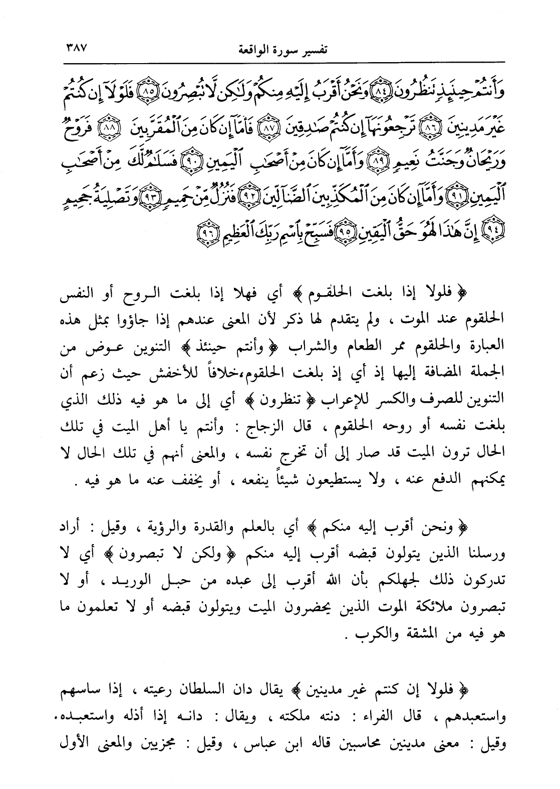 وَأَنْتُمْ حِينَئِذٍ تَنْظُرُونَ (84) وَنَحْنُ أَقْرَبُ إِلَيْهِ مِنْكُمْ وَلَكِنْ لَا تُبْصِرُونَ (85) فَلَوْلَا إِنْ كُنْتُمْ غَيْرَ مَدِينِينَ (86) تَرْجِعُونَهَا إِنْ كُنْتُمْ صَادِقِينَ (87) فَأَمَّا إِنْ كَانَ مِنَ الْمُقَرَّبِينَ (88) فَرَوْحٌ وَرَيْحَانٌ وَجَنَّتُ نَعِيمٍ (89) وَأَمَّا إِنْ كَانَ مِنْ أَصْحَابِ الْيَمِينِ (90) فَسَلَامٌ لَكَ مِنْ أَصْحَابِ الْيَمِينِ (91) وَأَمَّا إِنْ كَانَ مِنَ الْمُكَذِّبِينَ الضَّالِّينَ (92) فَنُزُلٌ مِنْ حَمِيمٍ (93) وَتَصْلِيَةُ جَحِيمٍ (94) إِنَّ هَذَا لَهُوَ حَقُّ الْيَقِينِ (95) فَسَبِّحْ بِاسْمِ رَبِّكَ الْعَظِيمِ (96)
