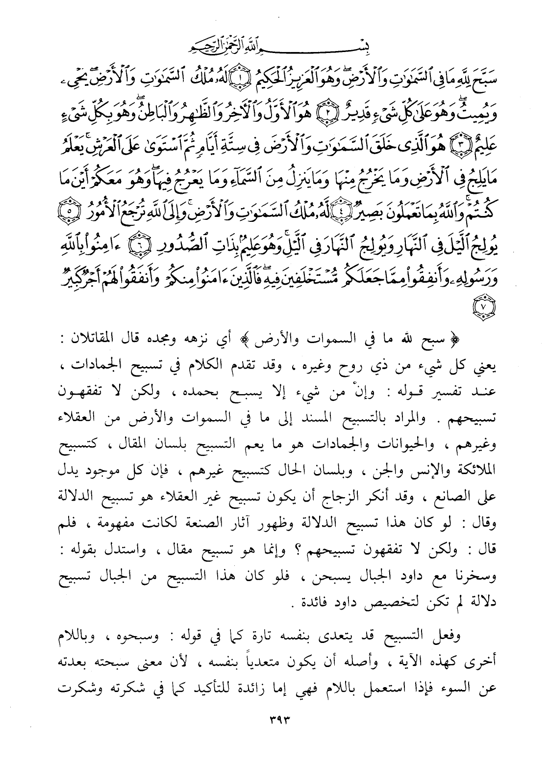 سَبَّحَ لِلَّهِ مَا فِي السَّمَاوَاتِ وَالْأَرْضِ وَهُوَ الْعَزِيزُ الْحَكِيمُ (1) لَهُ مُلْكُ السَّمَاوَاتِ وَالْأَرْضِ يُحْيِي وَيُمِيتُ وَهُوَ عَلَى كُلِّ شَيْءٍ قَدِيرٌ (2) هُوَ الْأَوَّلُ وَالْآخِرُ وَالظَّاهِرُ وَالْبَاطِنُ وَهُوَ بِكُلِّ شَيْءٍ عَلِيمٌ (3) هُوَ الَّذِي خَلَقَ السَّمَاوَاتِ وَالْأَرْضَ فِي سِتَّةِ أَيَّامٍ ثُمَّ اسْتَوَى عَلَى الْعَرْشِ يَعْلَمُ مَا يَلِجُ فِي الْأَرْضِ وَمَا يَخْرُجُ مِنْهَا وَمَا يَنْزِلُ مِنَ السَّمَاءِ وَمَا يَعْرُجُ فِيهَا وَهُوَ مَعَكُمْ أَيْنَ مَا كُنْتُمْ وَاللَّهُ بِمَا تَعْمَلُونَ بَصِيرٌ (4) لَهُ مُلْكُ السَّمَاوَاتِ وَالْأَرْضِ وَإِلَى اللَّهِ تُرْجَعُ الْأُمُورُ (5) يُولِجُ اللَّيْلَ فِي النَّهَارِ وَيُولِجُ النَّهَارَ فِي اللَّيْلِ وَهُوَ عَلِيمٌ بِذَاتِ الصُّدُورِ (6) آمِنُوا بِاللَّهِ وَرَسُولِهِ وَأَنْفِقُوا مِمَّا جَعَلَكُمْ مُسْتَخْلَفِينَ فِيهِ فَالَّذِينَ آمَنُوا مِنْكُمْ وَأَنْفَقُوا لَهُمْ أَجْرٌ كَبِيرٌ (7)