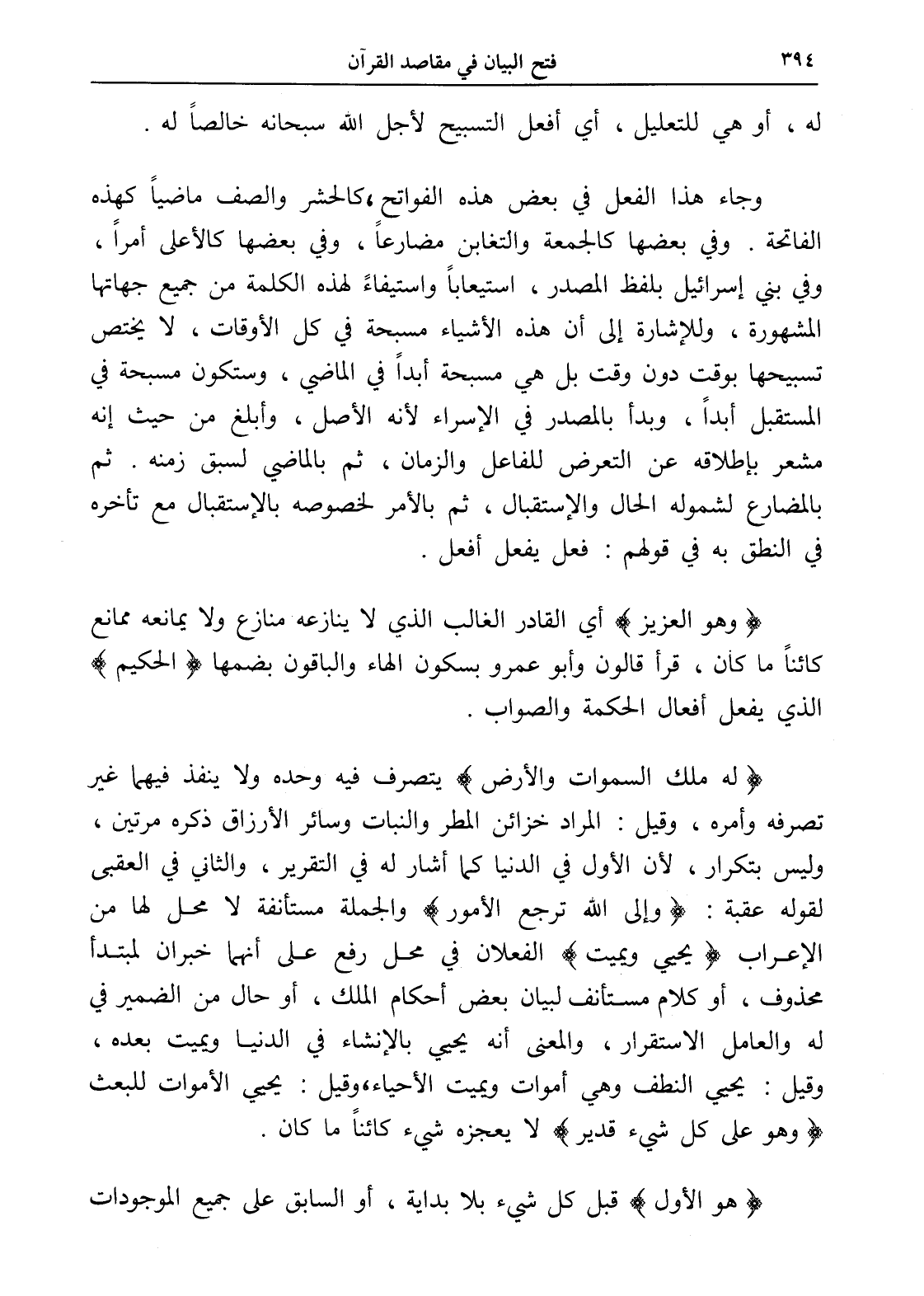 وجاء هذا الفعل في بعض هذه الفواتح، كالحشر والصف ماضياً كهذه الفاتحة. وفي بعضها كالجمعة والتغابن مضارعاً، وفي بعضها كالأعلى أمراً، وفي بني إسرائيل بلفظ المصدر، استيعاباً واستيفاءً لهذه الكلمة من جميع جهاتها المشهورة، وللإشارة إلى أن هذه الأشياء مسبحة في كل الأوقات، لا يختص تسبيحها بوقت دون وقت بل هي مسبحة أبداً في الماضي، وستكون مسبحة في المستقبل أبداً، وبدأ بالمصدر في الإسراء لأنه الأصل، وأبلغ من حيث إنه مشعر بإطلاقه عن التعرض للفاعل والزمان، ثم بالماضي لسبق زمنه. ثم بالمضارع لشموله الحال والإستقبال، ثم بالأمر لخصوصه بالإستقبال مع تأخره في النطق به في قولهم: فعل يفعل أفعل.