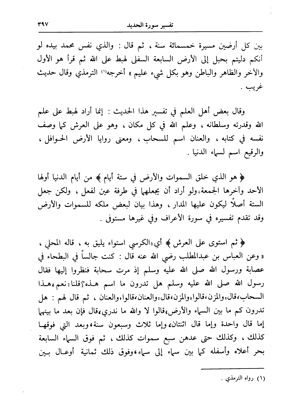 بين كل أرضين مسيرة خمسمائة سنة، ثم قال: والذي نفس محمد بيده لو أنكم دليتم بحبل إلى الأرض السابعة السفلى لهبط على الله ثم قرأ هو الأول والآخر والظاهر والباطن وهو بكل شيء عليم " أخرجه (¬1) الترمذي وقال حديث غريب.