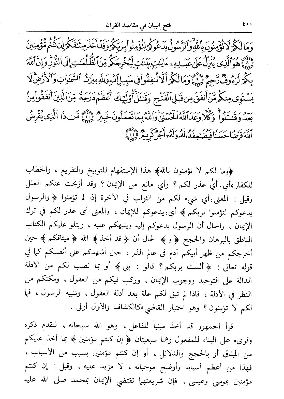 وَمَا لَكُمْ لَا تُؤْمِنُونَ بِاللَّهِ وَالرَّسُولُ يَدْعُوكُمْ لِتُؤْمِنُوا بِرَبِّكُمْ وَقَدْ أَخَذَ مِيثَاقَكُمْ إِنْ كُنْتُمْ مُؤْمِنِينَ (8) هُوَ الَّذِي يُنَزِّلُ عَلَى عَبْدِهِ آيَاتٍ بَيِّنَاتٍ لِيُخْرِجَكُمْ مِنَ الظُّلُمَاتِ إِلَى النُّورِ وَإِنَّ اللَّهَ بِكُمْ لَرَءُوفٌ رَحِيمٌ (9) وَمَا لَكُمْ أَلَّا تُنْفِقُوا فِي سَبِيلِ اللَّهِ وَلِلَّهِ مِيرَاثُ السَّمَاوَاتِ وَالْأَرْضِ لَا يَسْتَوِي مِنْكُمْ مَنْ أَنْفَقَ مِنْ قَبْلِ الْفَتْحِ وَقَاتَلَ أُولَئِكَ أَعْظَمُ دَرَجَةً مِنَ الَّذِينَ أَنْفَقُوا مِنْ بَعْدُ وَقَاتَلُوا وَكُلًّا وَعَدَ اللَّهُ الْحُسْنَى وَاللَّهُ بِمَا تَعْمَلُونَ خَبِيرٌ (10) مَنْ ذَا الَّذِي يُقْرِضُ اللَّهَ قَرْضًا حَسَنًا فَيُضَاعِفَهُ لَهُ وَلَهُ أَجْرٌ كَرِيمٌ (11)