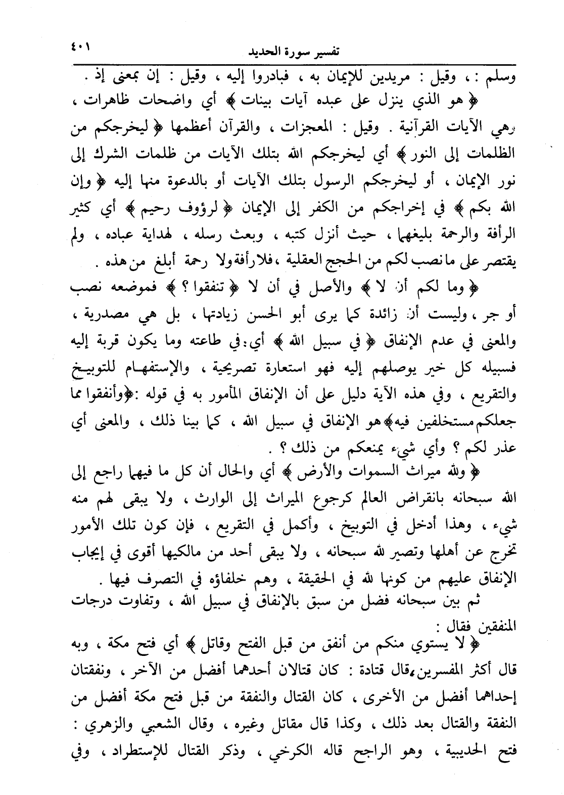 (لا يستوي منكم من أنفق من قبل الفتح وقاتل) أي فتح مكة، وبه قال أكثر المفسرين، قال قتادة: كان قتالان أحدهما أفضل من الآخر، ونفقتان إحداهما أفضل من الأخرى، كان القتال والنفقة من قبل فتح مكة أفضل من النفقة والقتال بعد ذلك، وكذا قال مقاتل وغيره، وقال الشعبي والزهري: فتح الحديبية، وهو الراجح قاله الكرخي، وذكر القتال للإستطراد، وفي