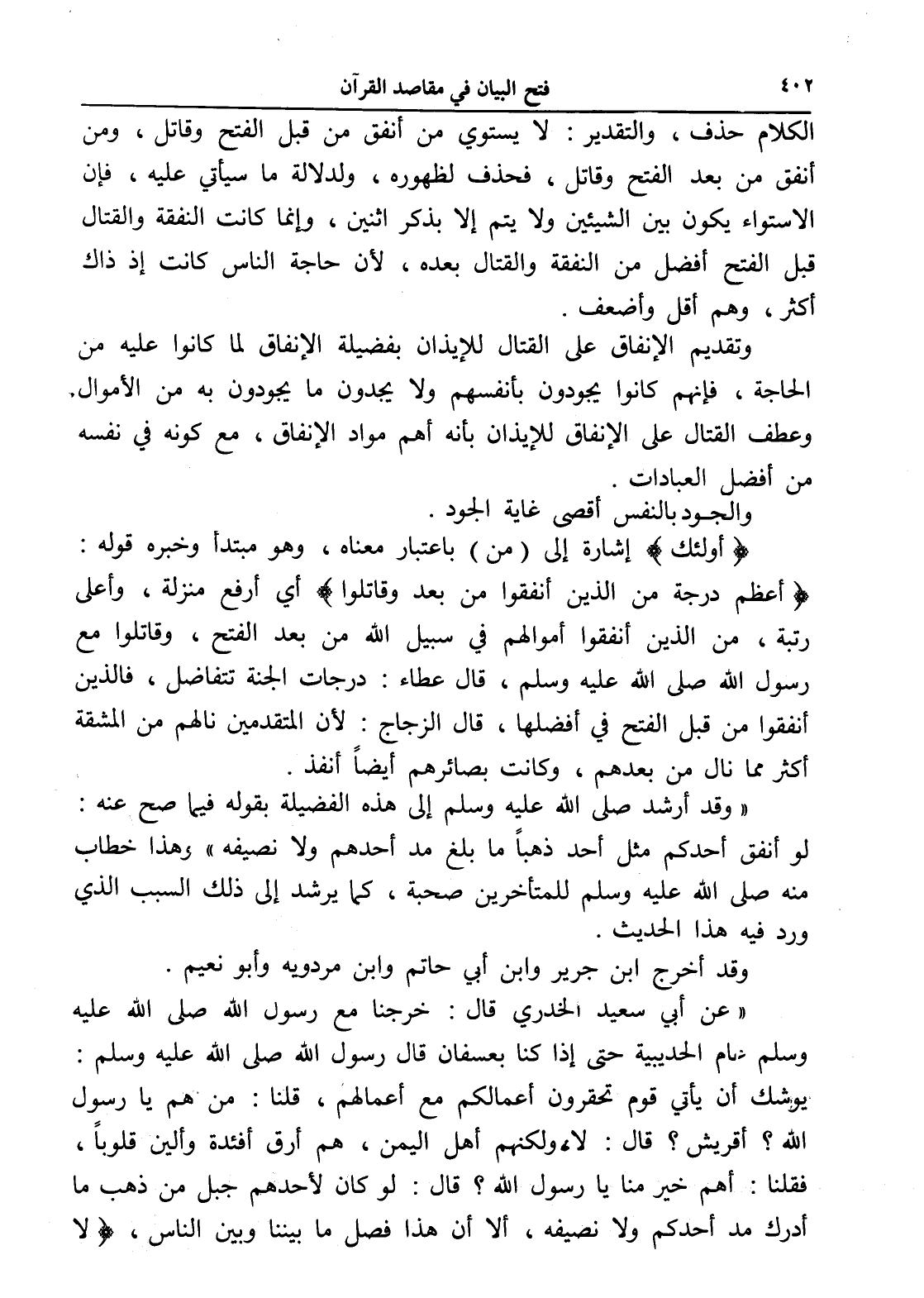 " وقد أرشد صلى الله عليه وسلم إلى هذه الفضيلة بقوله فيما صح عنه: لو أنفق أحدكم مثل أحد ذهباً ما بلغ مد أحدهم ولا نصيفه " وهذا خطاب منه صلى الله عليه وسلم للمتأخرين صحبة، كما يرشد إلى ذلك السبب الذي ورد فيه هذا الحديث.