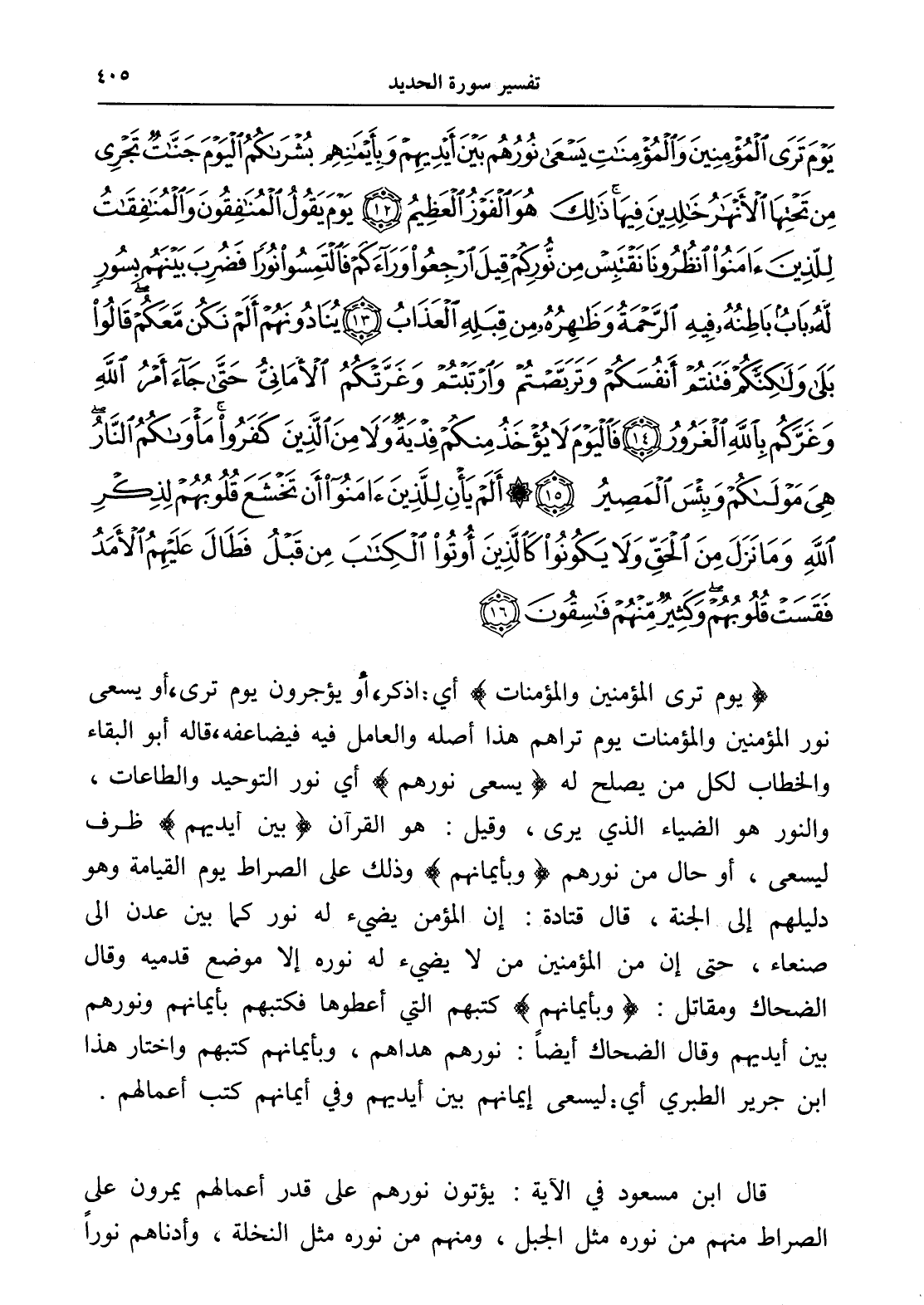 يَوْمَ تَرَى الْمُؤْمِنِينَ وَالْمُؤْمِنَاتِ يَسْعَى نُورُهُمْ بَيْنَ أَيْدِيهِمْ وَبِأَيْمَانِهِمْ بُشْرَاكُمُ الْيَوْمَ جَنَّاتٌ تَجْرِي مِنْ تَحْتِهَا الْأَنْهَارُ خَالِدِينَ فِيهَا ذَلِكَ هُوَ الْفَوْزُ الْعَظِيمُ (12) يَوْمَ يَقُولُ الْمُنَافِقُونَ وَالْمُنَافِقَاتُ لِلَّذِينَ آمَنُوا انْظُرُونَا نَقْتَبِسْ مِنْ نُورِكُمْ قِيلَ ارْجِعُوا وَرَاءَكُمْ فَالْتَمِسُوا نُورًا فَضُرِبَ بَيْنَهُمْ بِسُورٍ لَهُ بَابٌ بَاطِنُهُ فِيهِ الرَّحْمَةُ وَظَاهِرُهُ مِنْ قِبَلِهِ الْعَذَابُ (13) يُنَادُونَهُمْ أَلَمْ نَكُنْ مَعَكُمْ قَالُوا بَلَى وَلَكِنَّكُمْ فَتَنْتُمْ أَنْفُسَكُمْ وَتَرَبَّصْتُمْ وَارْتَبْتُمْ وَغَرَّتْكُمُ الْأَمَانِيُّ حَتَّى جَاءَ أَمْرُ اللَّهِ وَغَرَّكُمْ بِاللَّهِ الْغَرُورُ (14) فَالْيَوْمَ لَا يُؤْخَذُ مِنْكُمْ فِدْيَةٌ وَلَا مِنَ الَّذِينَ كَفَرُوا مَأْوَاكُمُ النَّارُ هِيَ مَوْلَاكُمْ وَبِئْسَ الْمَصِيرُ (15) أَلَمْ يَأْنِ لِلَّذِينَ آمَنُوا أَنْ تَخْشَعَ قُلُوبُهُمْ لِذِكْرِ اللَّهِ وَمَا نَزَلَ مِنَ الْحَقِّ وَلَا يَكُونُوا كَالَّذِينَ أُوتُوا الْكِتَابَ مِنْ قَبْلُ فَطَالَ عَلَيْهِمُ الْأَمَدُ فَقَسَتْ قُلُوبُهُمْ وَكَثِيرٌ مِنْهُمْ فَاسِقُونَ (16)