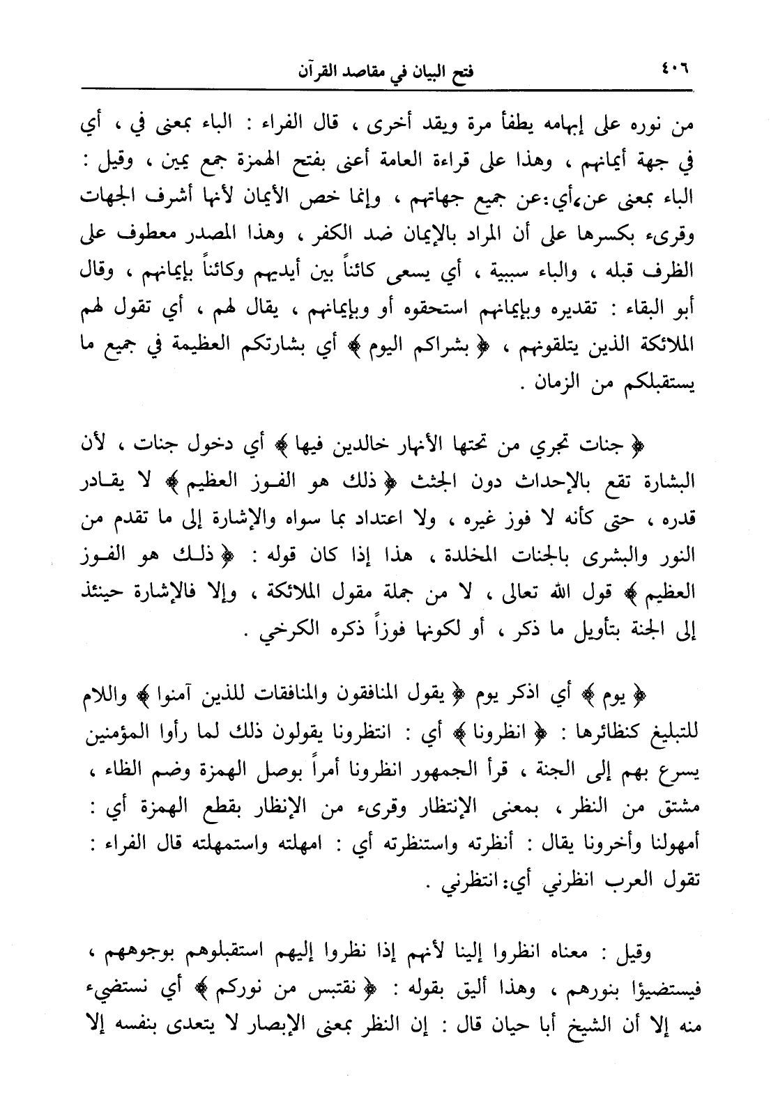 من نوره على إبهامه يطفأ مرة ويقد أخرى، قال الفراء: الباء بمعنى في، أي في جهة أيمانهم، وهذا على قراءة العامة أعنى بفتح الهمزة جمع يمين، وقيل: الباء بمعنى عن، أي: عن جميع جهاتهم، وإنما خص الأيمان لأنها أشرف الجهات وقرىء بكسرها على أن المراد بالإيمان ضد الكفر، وهذا المصدر معطوف على الظرف قبله، والباء سببية، أي يسعى كائناً بين أيديهم وكائناً بإيمانهم، وقال أبو البقاء: تقديره وبإيمانهم استحقوه أو وبإيمانهم، يقال لهم، أي تقول لهم الملائكة الذين يتلقونهم، (بشراكم اليوم) أي بشارتكم العظيمة في جميع ما يستقبلكم من الزمان.