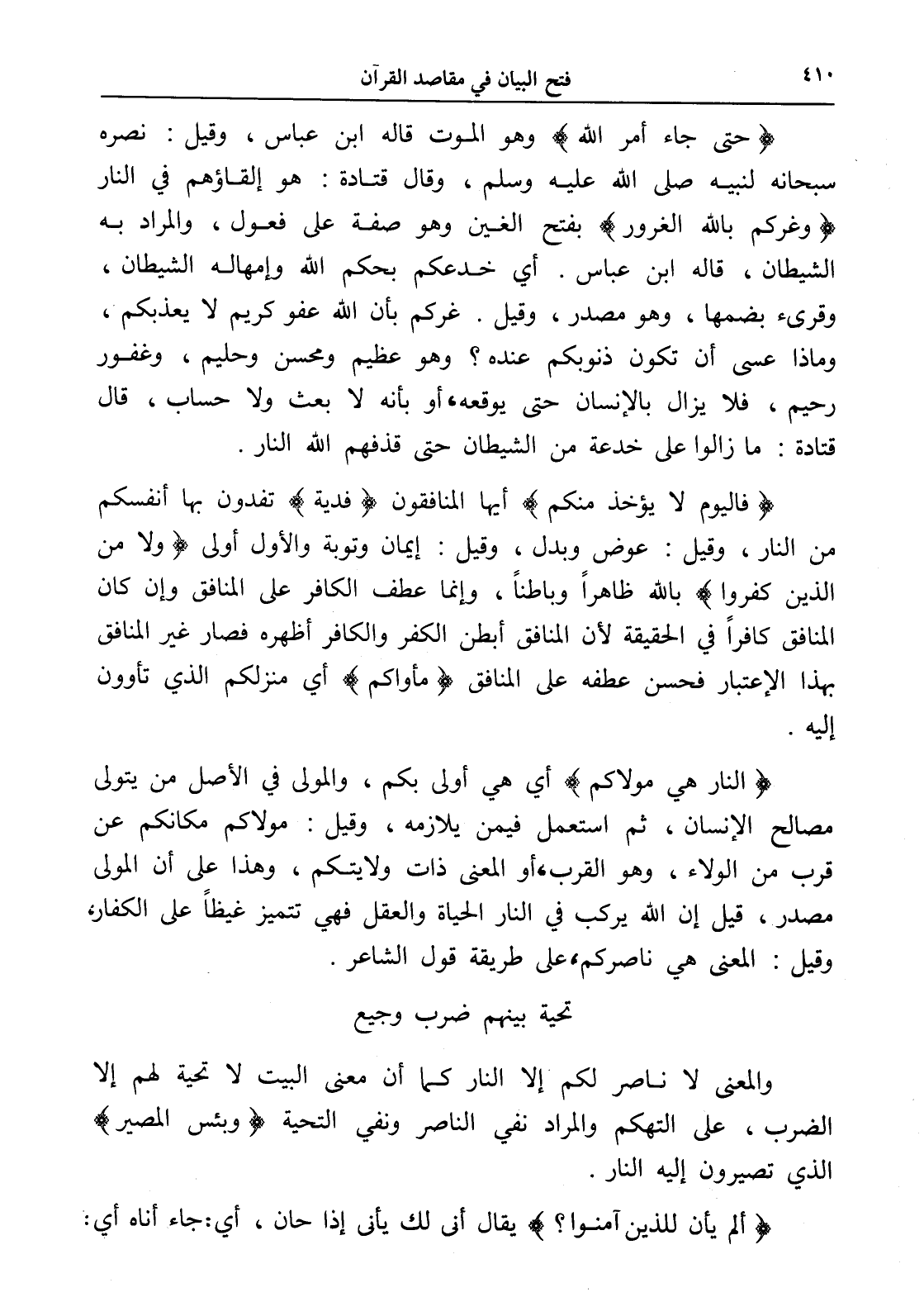 (النار هي مولاكم) أي هي أولى بكم، والمولى في الأصل من يتولى مصالح الإنسان، ثم استعمل فيمن يلازمه، وقيل: مولاكم مكانكم عن قرب من الولاء، وهو القرب، أو المعنى ذات ولايتكم، وهذا على أن المولى مصدر، قيل إن الله يركب في النار الحياة والعقل فهي تتميز غيظاً على الكفارة وقيل: المعنى هي ناصركم، على طريقة قول الشاعر: