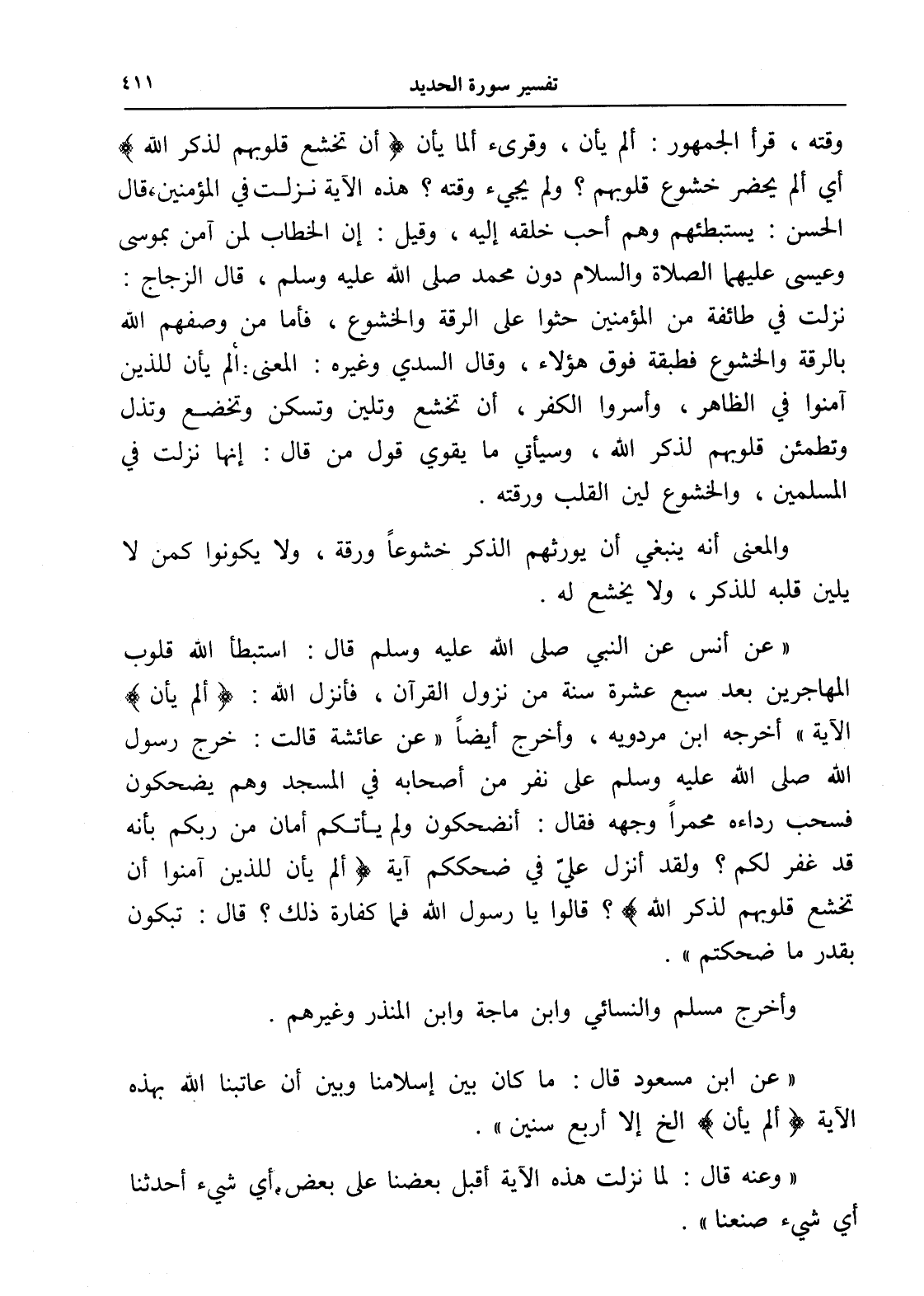 " عن أنس عن النبي صلى الله عليه وسلم قال: استبطأ الله قلوب المهاجرين بعد سبع عشرة سنة من نزول القرآن، فأنزل الله: (ألم يأن) الآية " أخرجه ابن مردويه، وأخرج أيضاًً " عن عائشة قالت: خرج رسول الله صلى الله عليه وسلم على نفر من أصحابه في المسجد وهم يضحكون فسحب رداءه محمراً وجهه فقال: أتضحكون ولم يأتكم أمان من ربكم بأنه قد غفر لكم؟ ولقد أنزل عليّ في ضحككم آية (ألم يأن للذين آمنوا أن تخشع قلوبهم لذكر الله)؟ قالوا يا رسول الله فما كفارة ذلك؟ قال: تبكون بقدر ما ضحكتم ".