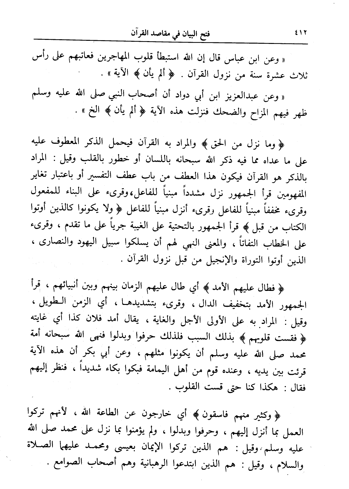 " وعن ابن عباس قال إن الله استبطأ قلوب المهاجرين فعاتبهم على رأس ثلاث عشرة سنة من نزول القرآن (ألم يأن) الآية ".