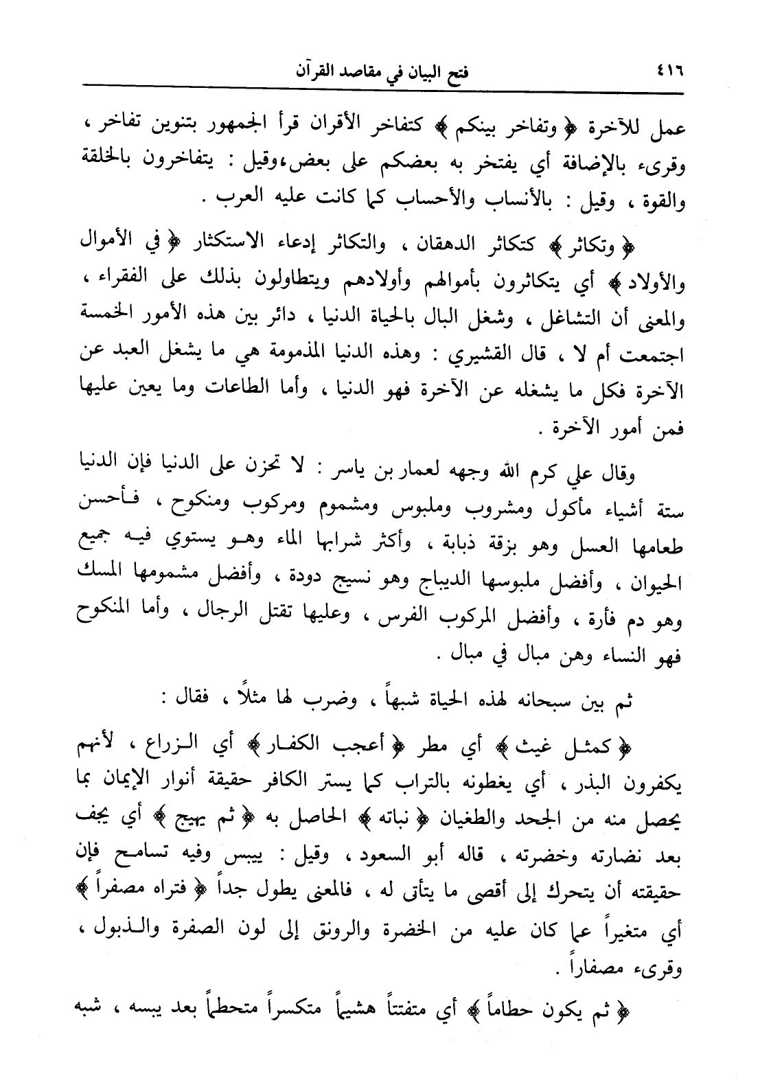 (وتكاثر) كتكاثر الدهقان، والتكاثر إدعاء الاستكثار (في الأموال والأولاد) أي يتكاثرون بأموالهم وأولادهم ويتطاولون بذلك على الفقراء، والمعنى أن التشاغل، وشغل البال بالحياة الدنيا، دائر بين هذه الأمور الخمسة اجتمعت أم لا، قال القشيري: وهذه الدنيا المذمومة هي ما يشغل العبد عن الآخرة فكل ما يشغله عن الآخرة فهو الدنيا، وأما الطاعات وما يعين عليها فمن أمور الآخرة.