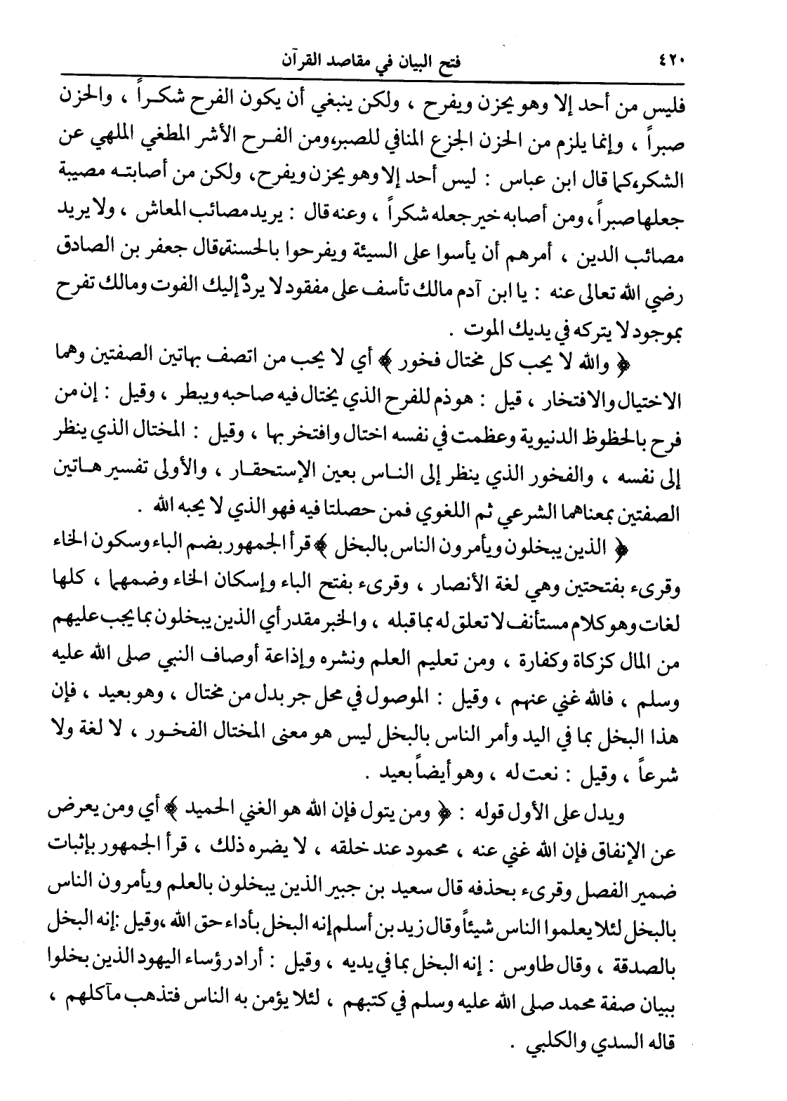 (والله لا يحب كل مختال فخور) أي لا يحب من اتصف بهاتين الصفتين وهما الاختيال والافتخار، قيل: هو ذم للفرح الذي يختال فيه صاحبه ويبطر، وقيل: إن من فرح بالحظوظ الدنيوية وعظمت في نفسه اختال وافتخر بها، وقيل: المختال الذي ينظر إلى نفسه، والفخور الذي ينظر إلى الناس بعين الإستحقار، والأولى تفسير هاتين الصفتين بمعناهما الشرعي ثم اللغوي فمن حصلتا فيه فهو الذي لا يحبه الله.
