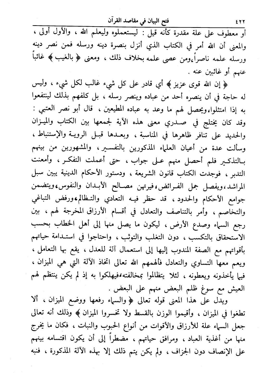 (إن الله قوي عزيز) أي قادر على كل شيء غالب لكل شيء، وليس له حاجة في أن ينصره أحد من عباده وينصر رسله، بل كلفهم بذلك لينتفعوا به إذا امتثلوا، ويحصل لهم ما وعد به عباده المطيعين، قال أبو نصر العتبي: وقد كان يختلج في صدري معنى هذه الآية لجمعها بين الكتاب والميزان والحديد على تنافر ظاهرها في المناسبة، وبعدها قبل الروية والإستنباط، وسألت عدة من أعيان العلماء المذكورين بالتفسير، والمشهورين من بينهم بالتذكير فلم أحصل منهم على جواب، حتى أعملت التفكر، وأمعنت التدبر، فوجدت الكتاب قانون الشريعة، ودستور الأحكام الدينية يبين سبل المراشد، ويفصل جمل الفرائض، فيرتهن مصالح الأبدان والنفوس، ويتضمن جوامع الأحكام والحدود، قد حظر فيه التعادي والتظالم، ورفض التباغي والتخاصم، وأمر بالتناصف والتعادل في أقسام الأرزاق المخرجة لهم، بين رجع السماء وصدع الأرض، ليكون ما يصل منها إلى أهل الخطاب بحسب الاستحقاق بالتكسب، دون التغلب والتوثب، واحتاجوا في استدامة حياتهم بأقواتهم مع الصفة المندوب إليها إلى استعمال آلة للعدل، يقع بها التعامل، ويعم معها التساوي والتعادل فألهمهم الله تعالى اتخاذ الآلة التي هي الميزان، فيما يأخذونه ويعطونه، لئلا يتظالموا بمخالفته، فيهلكوا به إذ لم يكن ينتظم لهم العيش مع سوغ ظلم البعض منهم على البعض.