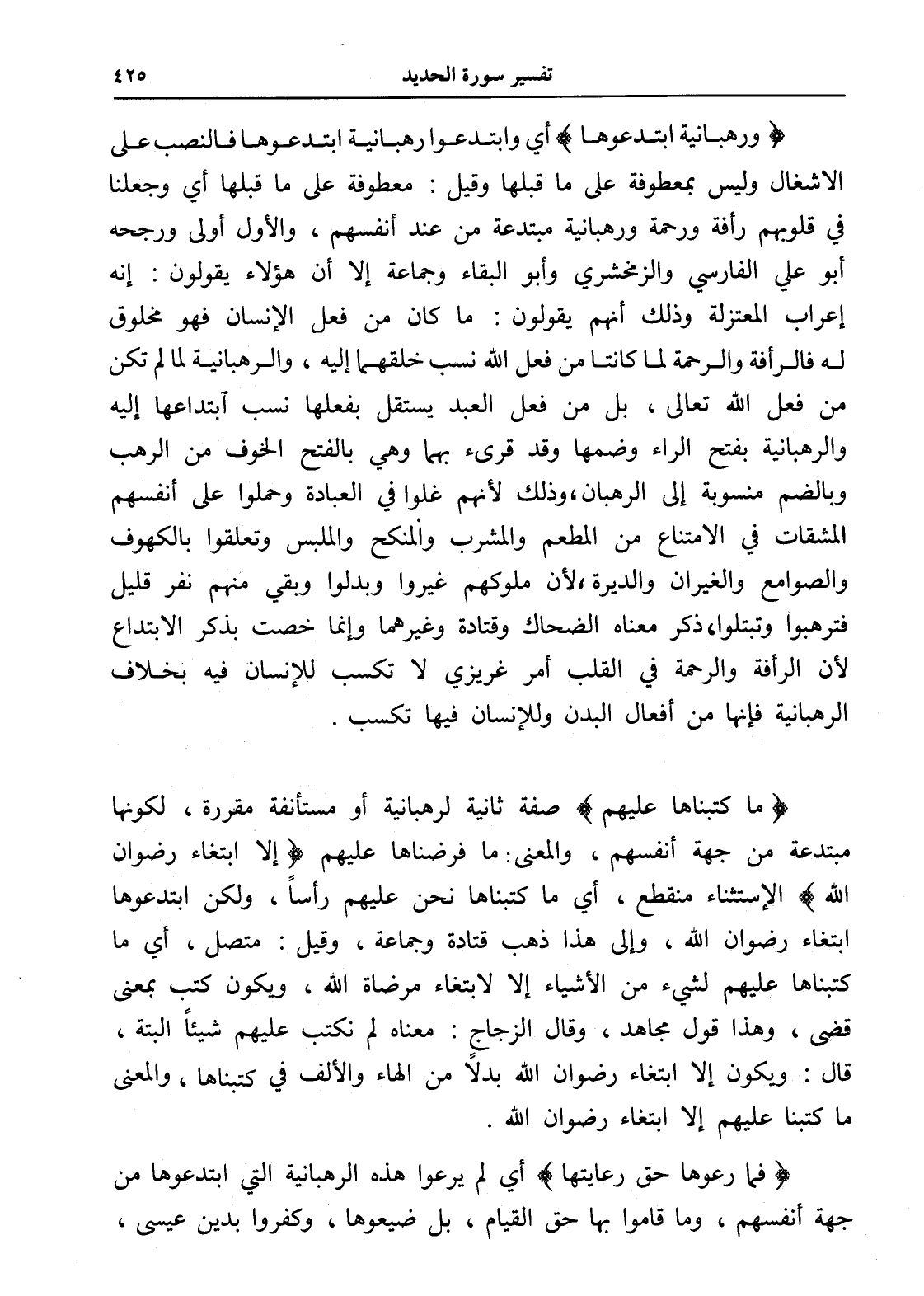 (ورهبانية ابتدعوها) أي وابتدعوا رهبانية ابتدعوها فالنصب على الاشغال وليس بمعطوفة على ما قبلها وقيل: معطوفة على ما قبلها أي وجعلنا في قلوبهم رأفة ورحمة ورهبانية مبتدعة من عند أنفسهم، والأول أولى ورجحه أبو علي الفارسي والزمخشري وأبو البقاء وجماعة إلا أن هؤلاء يقولون: إنه إعراب المعتزلة وذلك أنهم يقولون: ما كان من فعل الإنسان فهو مخلوق له فالرأفة والرحمة لما كانتا من فعل الله نسب خلقهما إليه، والرهبانية لما لم تكن من فعل الله تعالى، بل من فعل العبد يستقل بفعلها نسب ابتداعها إليه والرهبانية بفتح الراء وضمها وقد قرىء بهما وهي بالفتح الخوف من الرهب وبالضم منسوبة إلى الرهبان، وذلك لأنهم غلوا في العبادة وحملوا على أنفسهم المشقات في الامتناع من المطعم والمشرب والمنكح والملبس وتعلقوا بالكهوف والصوامع والغيران والديرة، لأن ملوكهم غيروا وبدلوا وبقي منهم نفر قليل فترهبوا وتبتلوا، ذكر معناه الضحاك وقتادة وغيرهما وإنما خصت بذكر الابتداع لأن الرأفة والرحمة في القلب أمر غريزي لا تكسب للإنسان فيه بخلاف الرهبانية فإنها من أفعال البدن وللإنسان فيها تكسب.