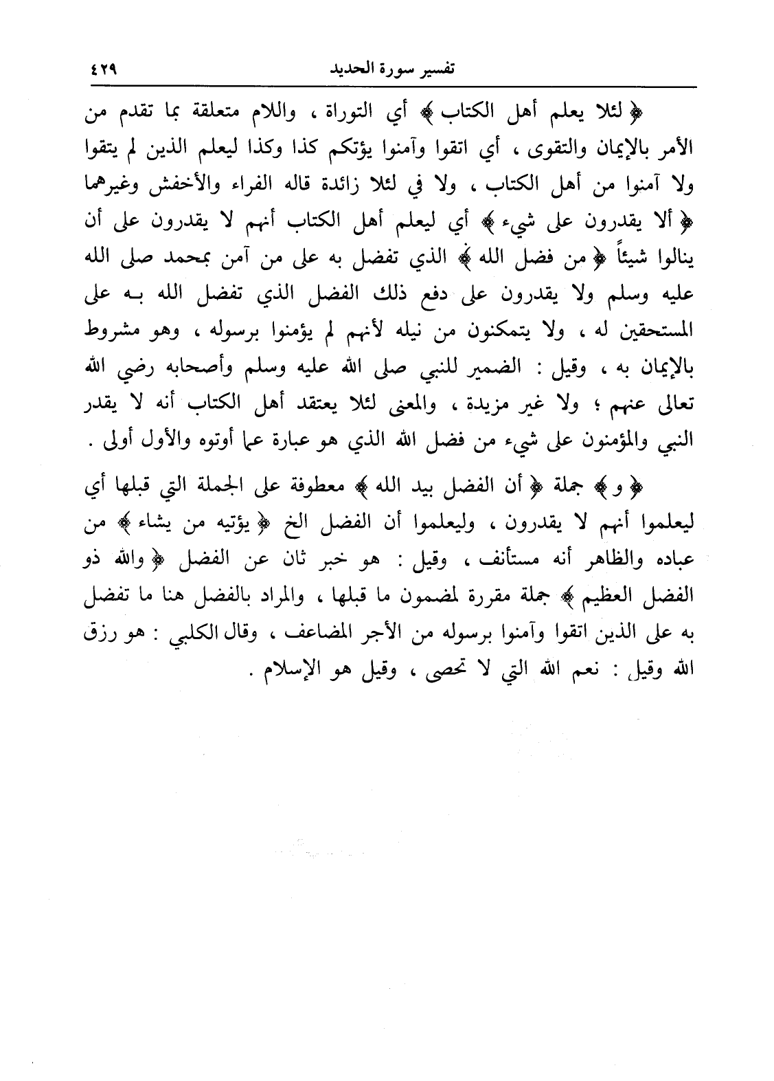 (لئلا يعلم أهل الكتاب) أي التوراة، واللام متعلقة بما تقدم من الأمر بالإيمان والتقوى، أي اتقوا وآمنوا يؤتكم كذا وكذا ليعلم الذين لم يتقوا ولا آمنوا من أهل الكتاب، ولا في لئلا زائدة قاله الفراء والأخفش وغيرهما (ألا يقدرون على شيء) أي ليعلم أهل الكتاب أنهم لا يقدرون على أن ينالوا شيئاً (من فضل الله) الذي تفضل به على من آمن بمحمد صلى الله عليه وسلم ولا يقدرون على دفع ذلك الفضل الذي تفضل الله به على المستحقين له، ولا يتمكنون من نيله لأنهم لم يؤمنوا برسوله، وهو مشروط بالإيمان به، وقيل: الضمير للنبي صلى الله عليه وسلم وأصحابه رضي الله تعالى عنهم؛ ولا غير مزيدة، والمعنى لئلا يعتقد أهل الكتاب أنه لا يقدر النبي والمؤمنون على شيء من فضل الله الذي هو عبارة عما أوتوه والأول أولى.