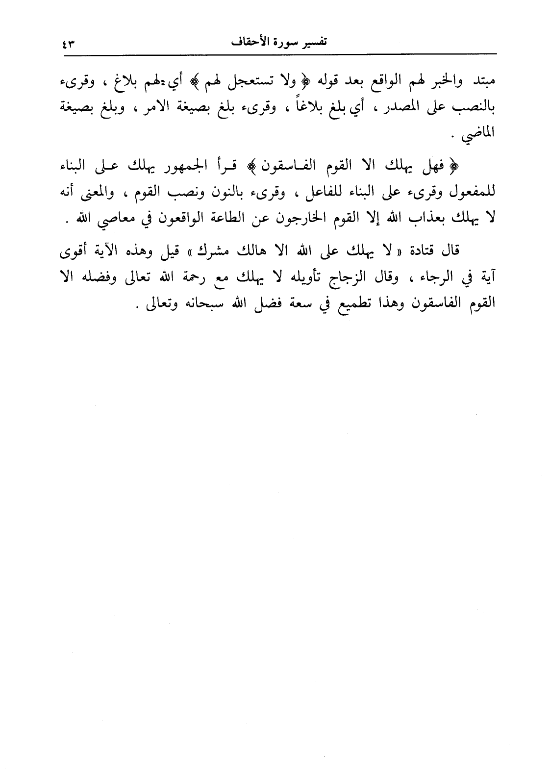 قال قتادة " لا يهلك على الله إلا هالك مشرك " قيل وهذه الآية أقوى آية في الرجاء " وقال الزجاج تأويله لا يهلك مع رحمة الله تعالى وفضله إلا القوم الفاسقون وهذا تطميع في سعة فضل الله سبحانه وتعالى.