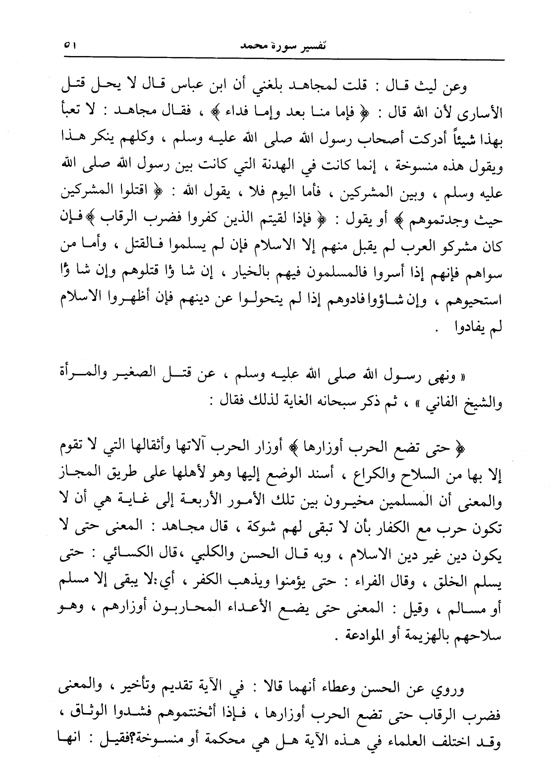 وعن ليث قال: قلت لمجاهد بلغني أن ابن عباس قال لا يحل قتل الأسارى لأن الله قال: (فإما منا بعد وإما فداء)، فقال مجاهد: لا تعبأ بهذا شيئاًً أدركت أصحاب رسول الله صلى الله عليه وسلم، وكلهم ينكر هذا ويقول هذه منسوخة، إنما كانت في الهدنة التي كانت بين رسول الله صلى الله عليه وسلم، وبين المشركين، فأما اليوم فلا، يقول الله: (اقتلوا المشركين حيث وجدتموهم) أو يقول: (فإذا لقيتم الذين كفروا فضرب الرقاب) فإن كان مشركو العرب لم يقبل منهم إلا الإسلام فإن لم يسلموا فالقتل، وأما من سواهم فإنهم إذا أسروا فالمسلمون فيهم بالخيار، إن شاؤا قتلوهم وإن شاؤا استحيوهم، وإن شاؤوا فادوهم إذا لم يتحولوا عن دينهم فإن أظهروا الإسلام لم يفادوا.