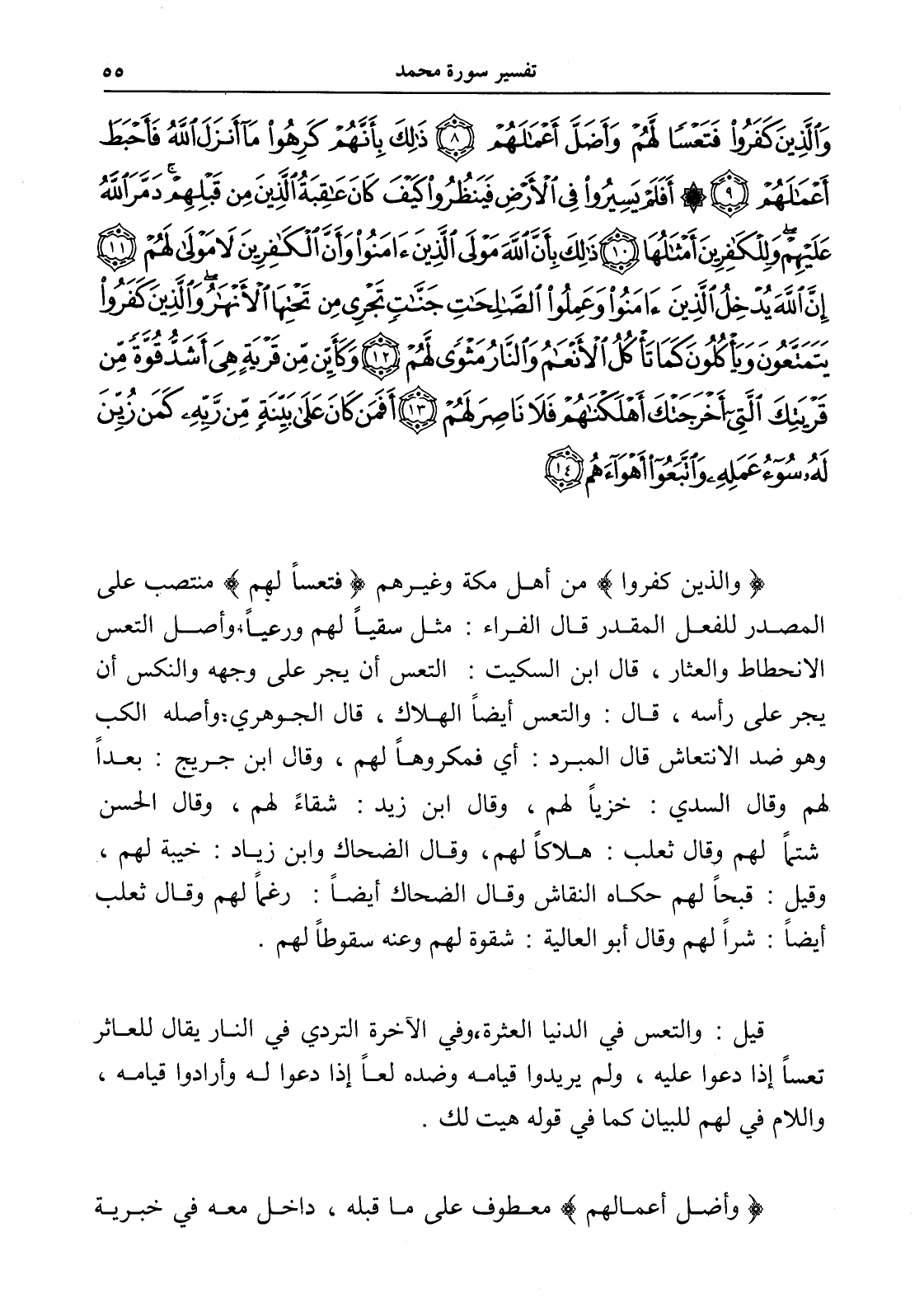 وَالَّذِينَ كَفَرُوا فَتَعْسًا لَهُمْ وَأَضَلَّ أَعْمَالَهُمْ (8) ذَلِكَ بِأَنَّهُمْ كَرِهُوا مَا أَنْزَلَ اللَّهُ فَأَحْبَطَ أَعْمَالَهُمْ (9) أَفَلَمْ يَسِيرُوا فِي الْأَرْضِ فَيَنْظُرُوا كَيْفَ كَانَ عَاقِبَةُ الَّذِينَ مِنْ قَبْلِهِمْ دَمَّرَ اللَّهُ عَلَيْهِمْ وَلِلْكَافِرِينَ أَمْثَالُهَا (10) ذَلِكَ بِأَنَّ اللَّهَ مَوْلَى الَّذِينَ آمَنُوا وَأَنَّ الْكَافِرِينَ لَا مَوْلَى لَهُمْ (11) إِنَّ اللَّهَ يُدْخِلُ الَّذِينَ آمَنُوا وَعَمِلُوا الصَّالِحَاتِ جَنَّاتٍ تَجْرِي مِنْ تَحْتِهَا الْأَنْهَارُ وَالَّذِينَ كَفَرُوا يَتَمَتَّعُونَ وَيَأْكُلُونَ كَمَا تَأْكُلُ الْأَنْعَامُ وَالنَّارُ مَثْوًى لَهُمْ (12) وَكَأَيِّنْ مِنْ قَرْيَةٍ هِيَ أَشَدُّ قُوَّةً مِنْ قَرْيَتِكَ الَّتِي أَخْرَجَتْكَ أَهْلَكْنَاهُمْ فَلَا نَاصِرَ لَهُمْ (13) أَفَمَنْ كَانَ عَلَى بَيِّنَةٍ مِنْ رَبِّهِ كَمَنْ زُيِّنَ لَهُ سُوءُ عَمَلِهِ وَاتَّبَعُوا أَهْوَاءَهُمْ (14)
