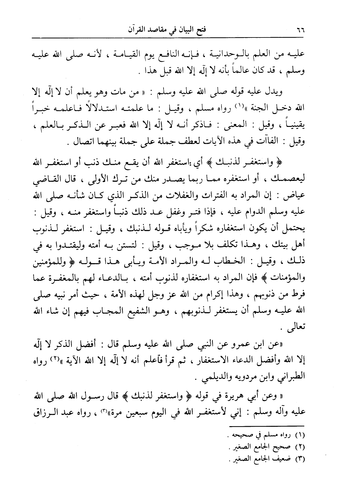 ويدل عليه قوله صلى الله عليه وسلم: " من مات وهو يعلم أن لا إله إلا الله دخل الجنة " (¬1) رواه مسلم، وقيل: ما علمته استدلالاً فاعلمه خبراً يقينياً، وقيل: المعنى: فاذكر أنه لا إله إلا الله فعبر عن الذكر بالعلم، وقيل: الفاآت في هذه الآيات لعطف جملة على جملة بينهما اتصال.
