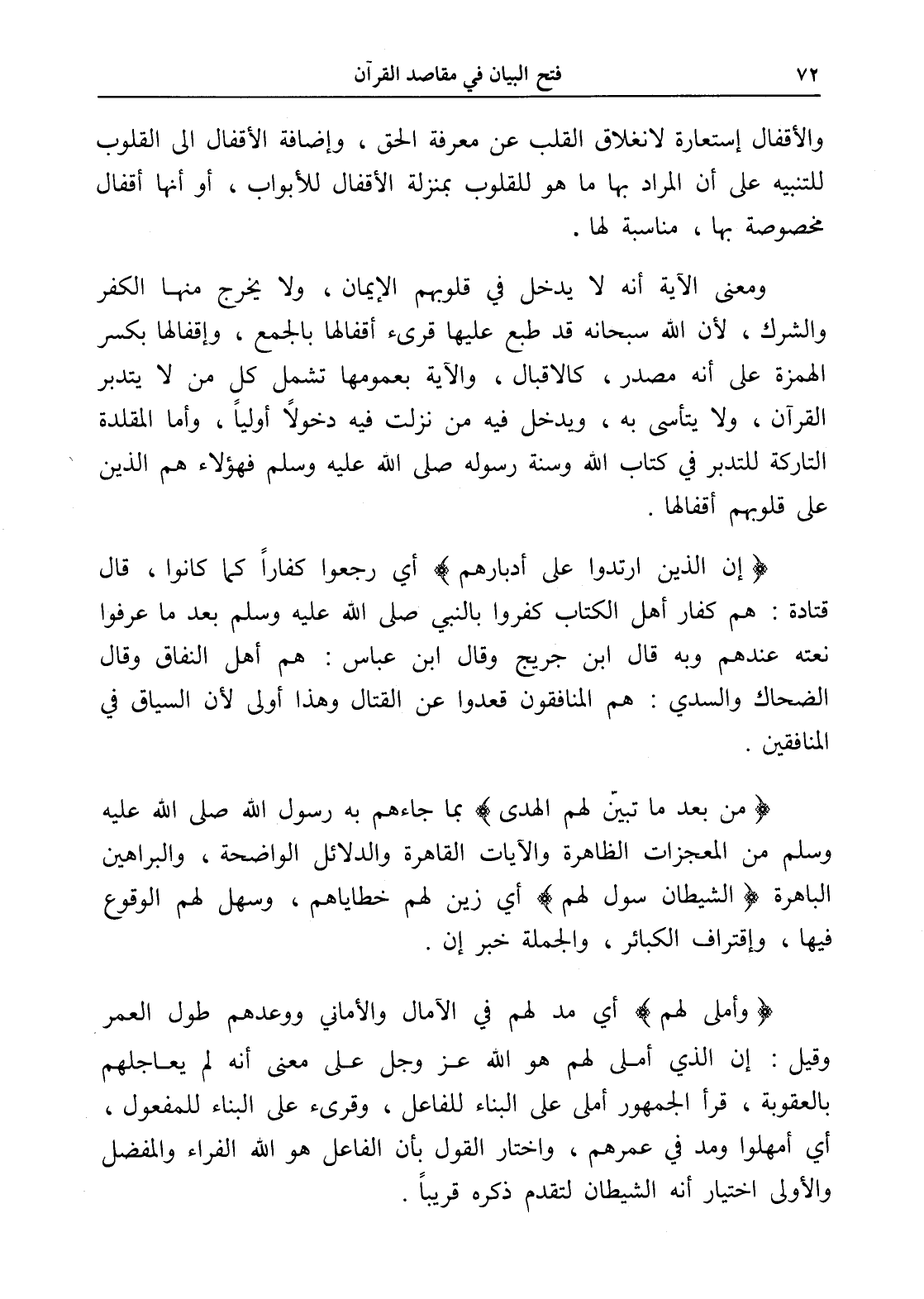 ومعنى الآية أنه لا يدخل في قلوبهم الإيمان، ولا يخرج منها الكفر والشرك، لأن الله سبحانه قد طبع عليها قرىء أقفالها بالجمع، وإقفالها بكسر الهمزة على أنه مصدر، كالإقبال، والآية بعمومها تشمل كل من لا يتدبر القرآن، ولا يتأسى به، ويدخل فيه من نزلت فيه دخولاً أولياً، وأما المقلدة التاركة للتدبر في كتاب الله وسنة رسوله صلى الله عليه وسلم فهؤلاء هم الذين على قلوبهم أقفالها.