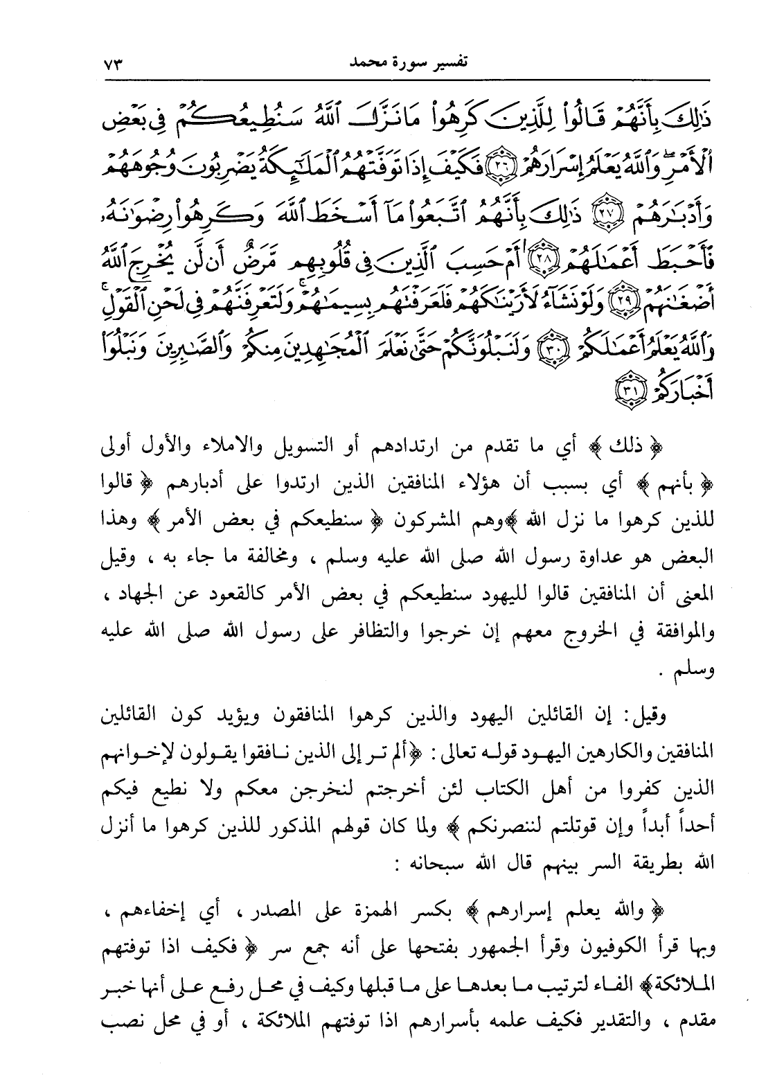 ذَلِكَ بِأَنَّهُمْ قَالُوا لِلَّذِينَ كَرِهُوا مَا نَزَّلَ اللَّهُ سَنُطِيعُكُمْ فِي بَعْضِ الْأَمْرِ وَاللَّهُ يَعْلَمُ إِسْرَارَهُمْ (26) فَكَيْفَ إِذَا تَوَفَّتْهُمُ الْمَلَائِكَةُ يَضْرِبُونَ وُجُوهَهُمْ وَأَدْبَارَهُمْ (27) ذَلِكَ بِأَنَّهُمُ اتَّبَعُوا مَا أَسْخَطَ اللَّهَ وَكَرِهُوا رِضْوَانَهُ فَأَحْبَطَ أَعْمَالَهُمْ (28) أَمْ حَسِبَ الَّذِينَ فِي قُلُوبِهِمْ مَرَضٌ أَنْ لَنْ يُخْرِجَ اللَّهُ أَضْغَانَهُمْ (29) وَلَوْ نَشَاءُ لَأَرَيْنَاكَهُمْ فَلَعَرَفْتَهُمْ بِسِيمَاهُمْ وَلَتَعْرِفَنَّهُمْ فِي لَحْنِ الْقَوْلِ وَاللَّهُ يَعْلَمُ أَعْمَالَكُمْ (30) وَلَنَبْلُوَنَّكُمْ حَتَّى نَعْلَمَ الْمُجَاهِدِينَ مِنْكُمْ وَالصَّابِرِينَ وَنَبْلُوَ أَخْبَارَكُمْ (31)