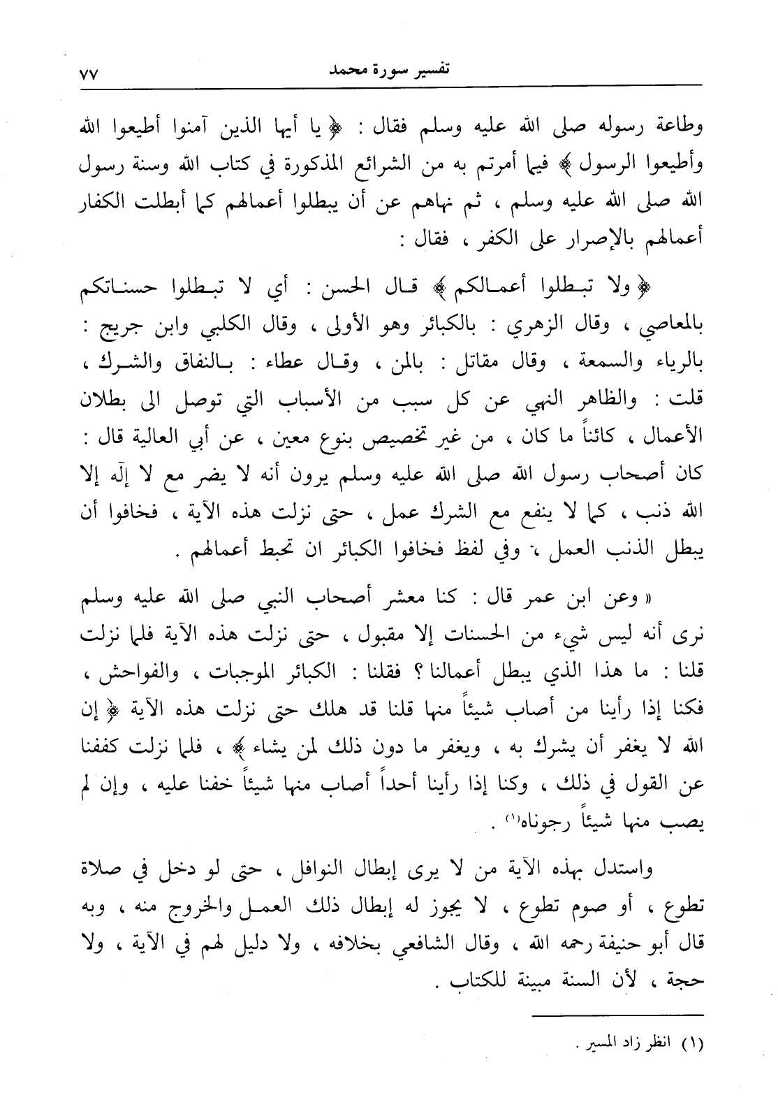 واستدل بهذه الآية من لا يرى إبطال النوافل، حتى لو دخل في صلاة تطوع، أو صوم تطوع، لا يجوز له إبطال ذلك العمل والخروج منه، وبه قال أبو حنيفة رحمه الله، وقال الشافعي بخلافه، ولا دليل لهم في الآية، ولا حجة، لأن السنة مبينة للكتاب.