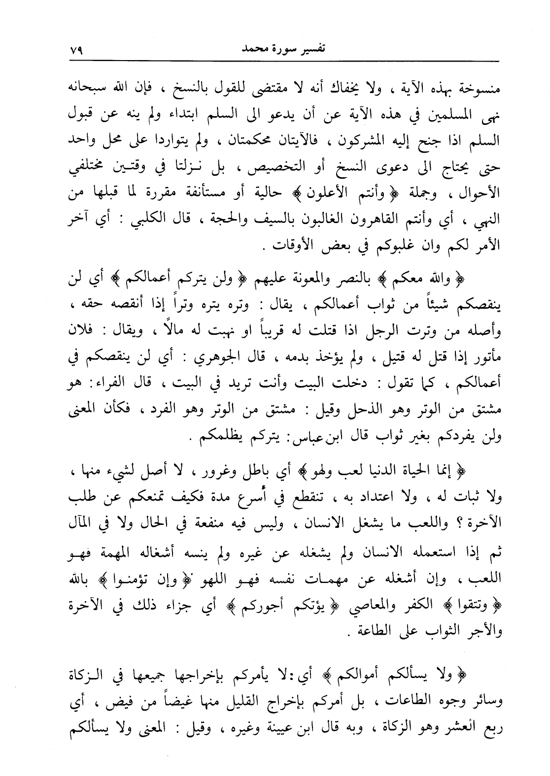 (والله معكم) بالنصر والمعونة عليهم (وَلَنْ يَتِرَكُمْ أَعْمَالَكُمْ) أي لن ينقصكم شيئاًً من ثواب أعمالكم، يقال: وتره يتره وتراً إذا أنقصه حقه، وأصله من وترت الرجل إذا قتلت له قريباً أو نهبت له مالاً، ويقال: فلان مأتور إذا قتل له قتيل، ولم يؤخذ بدمه، قال الجوهري: أي لن ينقصكم في أعمالكم، كما تقول: دخلت البيت وأنت تريد في البيت، قال الفراء: هو مشتق من الموتر وهو الذحل وقيل: مشتق من الموتر وهو الفرد، فكأن المعنى ولن يفردكم بغير ثواب قال ابن عباس: يتركم يظلمكم.