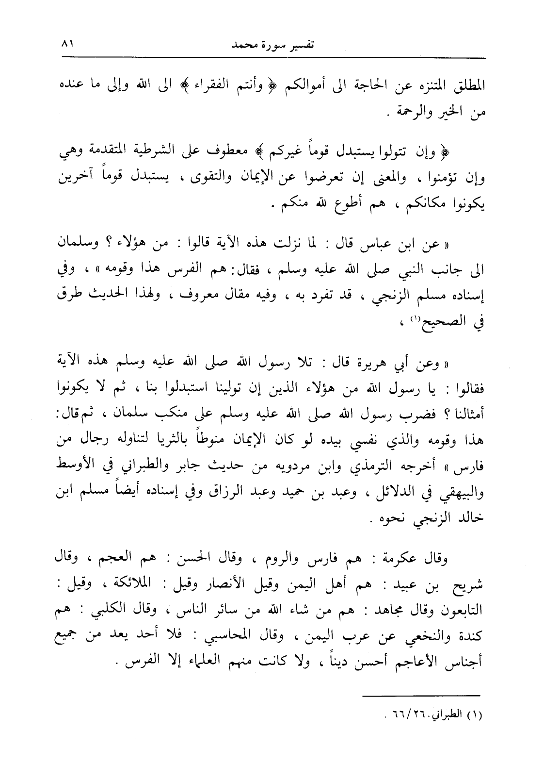 " وعن أبي هريرة قال: تلا رسول الله صلى الله عليه وسلم هذه الآية فقالوا: يا رسول الله من هؤلاء الذين إن تولينا استبدلوا بنا، ثم لا يكونوا أمثالنا؟ فضرب رسول الله صلى الله عليه وسلم على منكب سلمان، ثم قال: هذا وقومه والذي نفسي بيده لو كان الإيمان منوطاً بالثريا لتناوله رجال من فارس " أخرجه الترمذي وابن مردويه من حديث جابر والطبراني في الأوسط والبيهقي في الدلائل، وعبد بن حميد وعبد الرزاق وفي إسناده أيضاًً مسلم ابن خالد الزنجي نحوه.