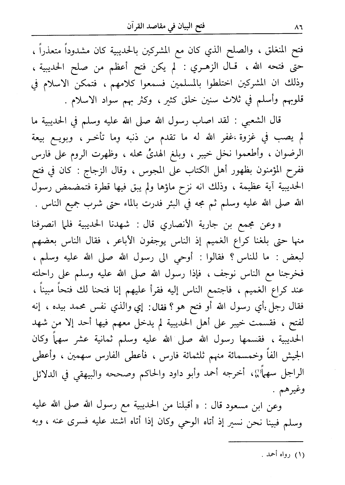 فتح المنغلق، والصلح الذي كان مع المشركين بالحديبية كان مشدوداً متعذراً، حتى فتحه الله، قال الزهري: لم يكن فتح أعظم من صلح الحديبية، وذلك أن المشركين اختلطوا بالمسلمين فسمعوا كلامهم، فتمكن الإسلام في قلوبهم وأسلم في ثلاث سنين خلق كثير، وكثر بهم سواد الإسلام.