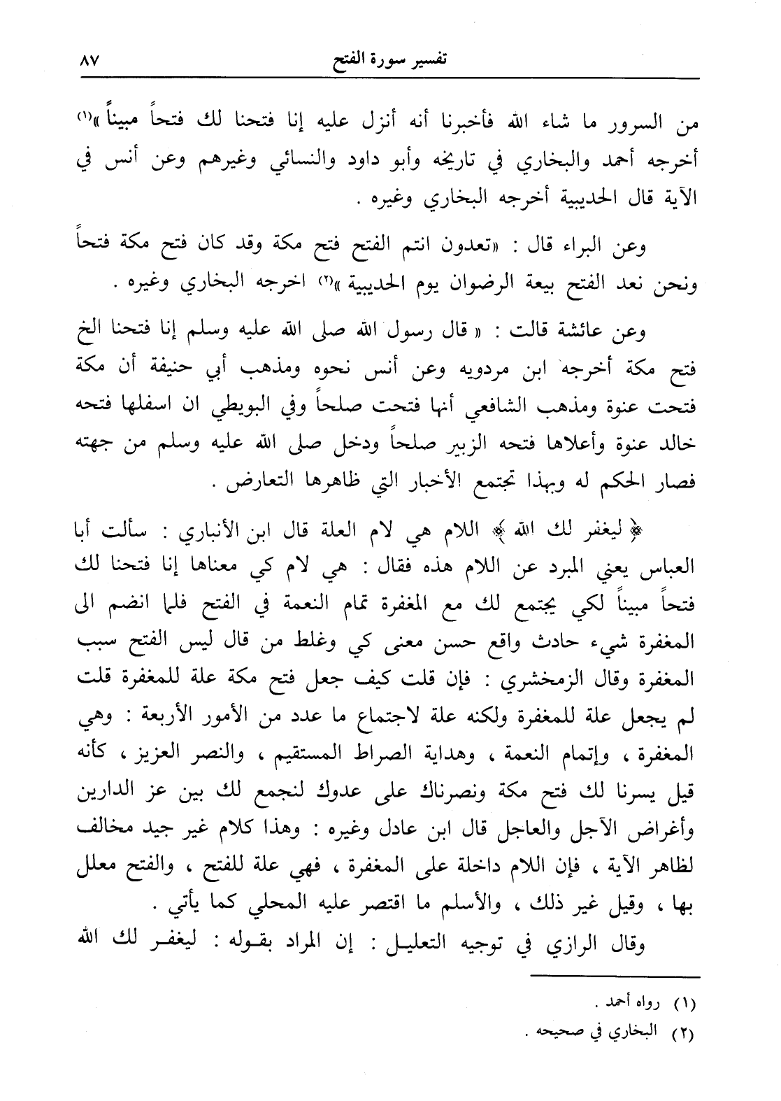 من السرور ما شاء الله فأخبرنا أنه أنزل عليه إنا فتحنا لك فتحاً مبيناً " (¬1) أخرجه أحمد والبخاري في تاريخه وأبو داود والنسائي وغيرهم وعن أنس في الآية قال الحديبية أخرجه البخاري وغيره.
