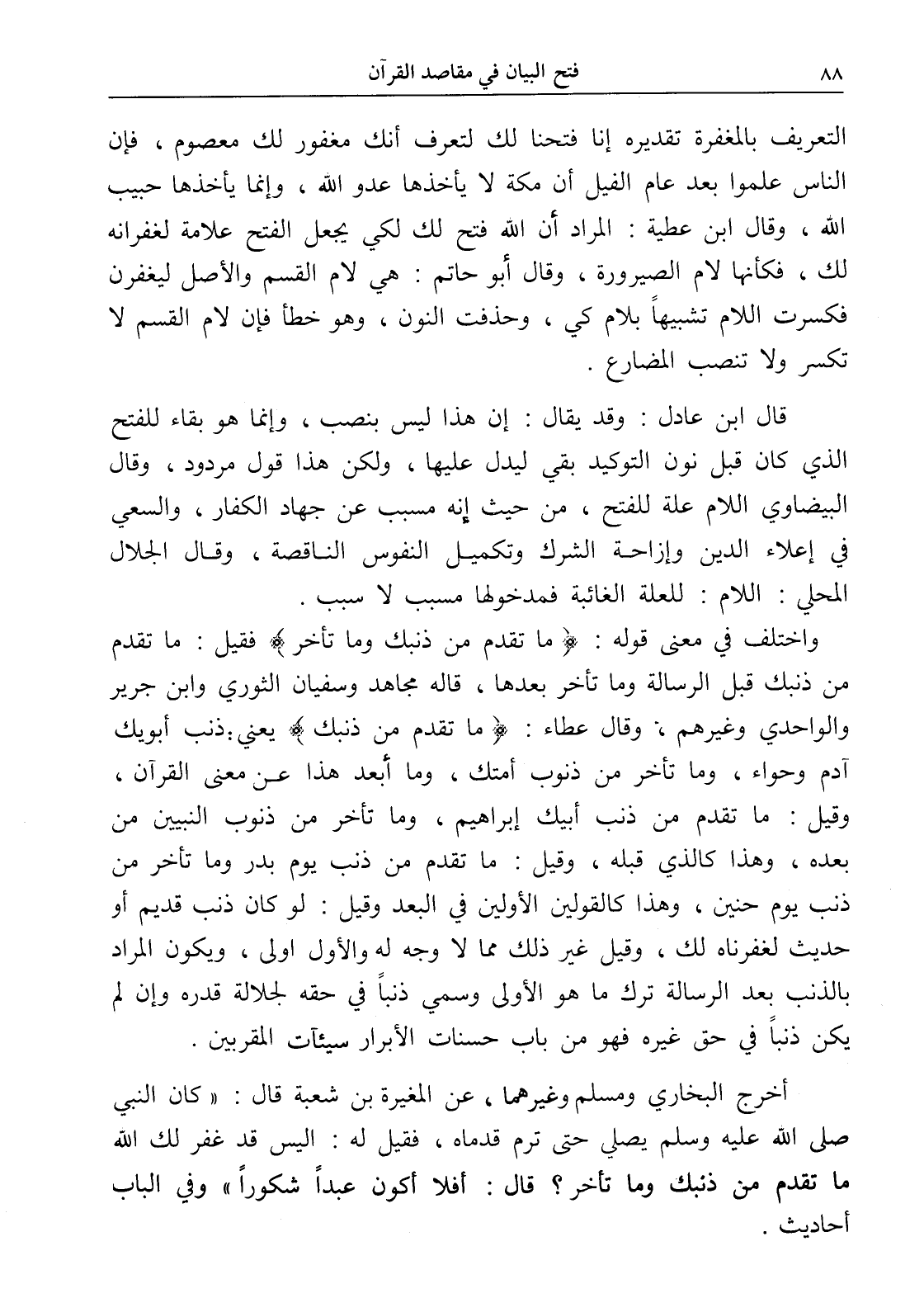 واختلف في معنى قوله: (ما تقدم من ذنبك وما تأخر) فقيل: ما تقدم من ذنبك قبل الرسالة وما تأخر بعدها، قاله مجاهد وسفيان الثوري وابن جرير والواحدي وغيرهم، وقال عطاء: (ما تقدم من ذنبك) يعني: ذنب أبويك آدم وحواء، وما تأخر من ذنوب أمتك، وما أبعد هذا عن معنى القرآن، وقيل: ما تقدم من ذنب أبيك إبراهيم، وما تأخر من ذنوب النبيين من بعده، وهذا كالذي قبله، وقيل: ما تقدم من ذنب يوم بدر وما تأخر من ذنب يوم حنين، وهذا كالقولين الأولين في البعد وقيل: لو كان ذنب قديم أو حديث لغفرناه لك، وقيل غير ذلك مما لا وجه له والأول أولى، ويكون المراد بالذنب بعد الرسالة ترك ما هو الأولى وسمي ذنباً في حقه لجلالة قدره وإن لم يكن ذنباً في حق غيره فهو من باب حسنات الأبرار سيئات المقربين.