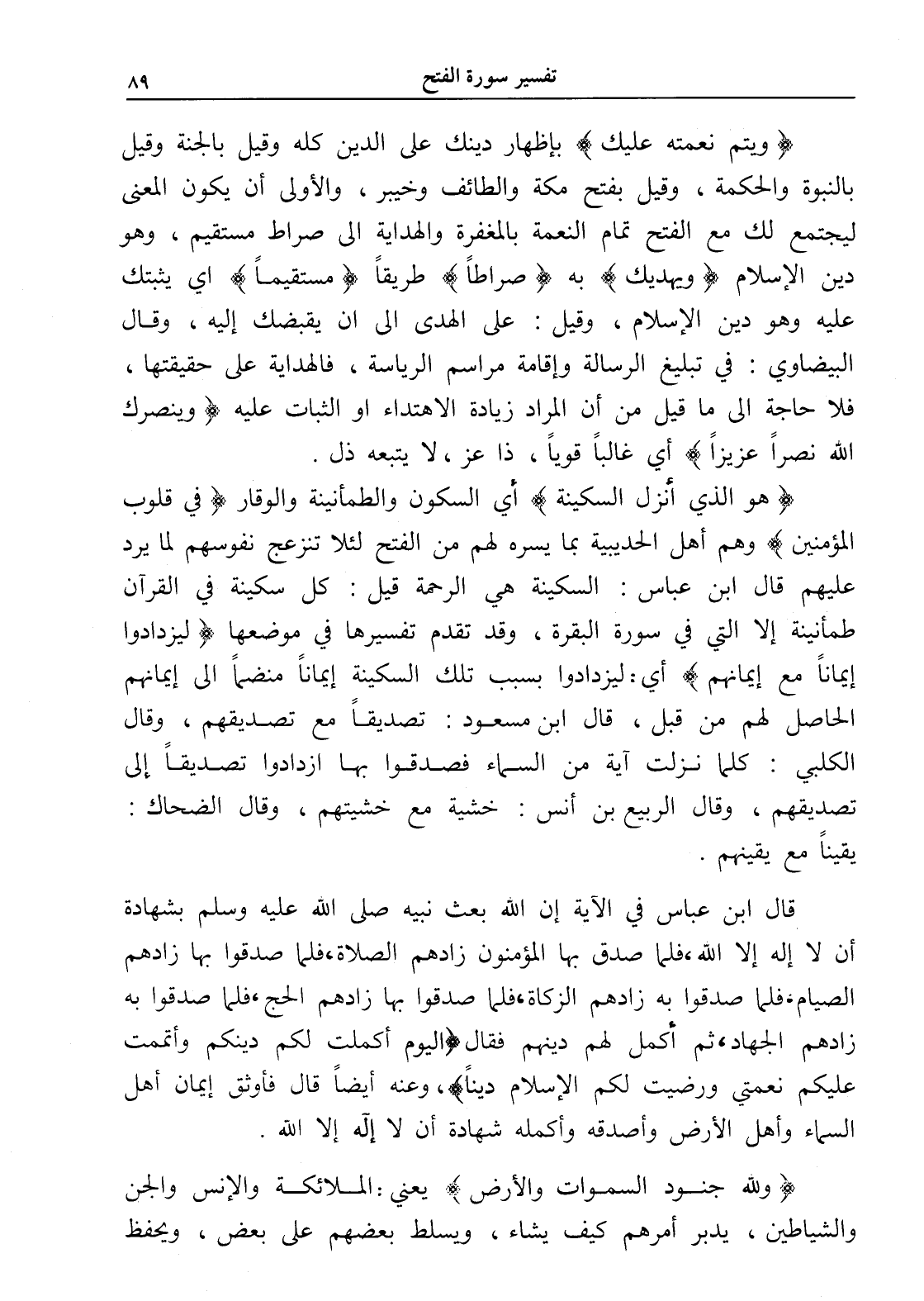(ويتم نعمته عليك) بإظهار دينك على الدين كله وقيل بالجنة وقيل بالنبوة والحكمة، وقيل بفتح مكة والطائف وخيبر، والأولى أن يكون المعنى ليجتمع لك مع الفتح تمام النعمة بالمغفرة والهداية إلى صراط مستقيم، وهو دين الإسلام (ويهديك) به (صراطاً) طريقاً (مستقيماً) أي يثبتك عليه وهو دين الإسلام، وقيل: على الهدى إلى أن يقبضك إليه، وقال البيضاوي: في تبليغ الرسالة وإقامة مراسم الرياسة، فالهداية على حقيقتها، فلا حاجة إلى ما قيل من أن المراد زيادة الاهتداء أو الثبات عليه