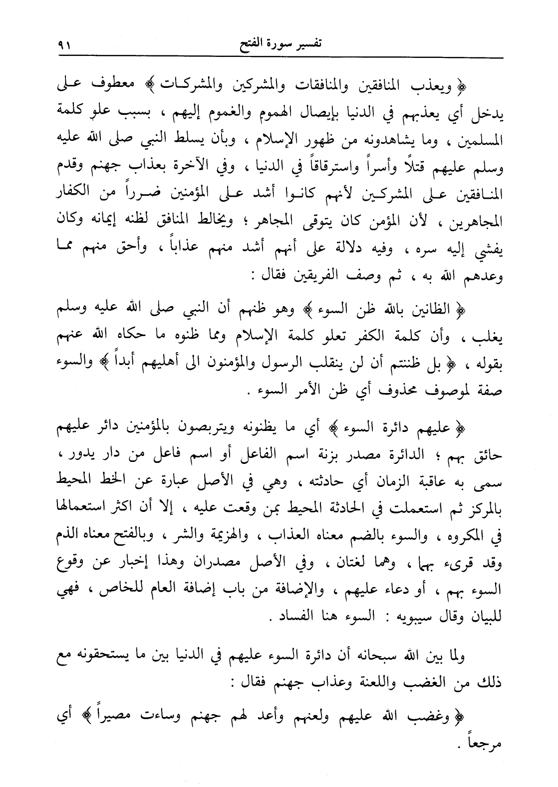 (عليهم دائرة السوء) أي ما يظنونه ويتربصون بالمؤمنين دائر عليهم حائق بهم؛ الدائرة مصدر بزنة اسم الفاعل أو اسم فاعل من دار يدور، سمى به عاقبة الزمان أي حادثته، وهي في الأصل عبارة عن الخط المحيط بالمركز ثم استعملت في الحادثة المحيط بمن وقعت عليه، إلا أن أكثر استعمالها في المكروه، والسوء بالضم معناه العذاب، والهزيمة والشر، وبالفتح معناه الذم وقد قرىء بهما، وهما لغتان، وفي الأصل مصدران وهذا إخبار عن وقوع السوء بهم، أو دعاء عليهم، والإضافة من باب إضافة العام للخاص، فهي للبيان وقال سيبويه: السوء هنا الفساد.